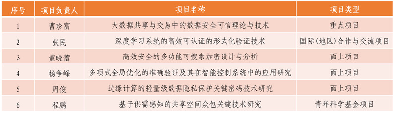 2021年度,德赢官网Vwin共有6项项目获国家自然科学基金委员会的资助批准,其中重点项目1项、国际(地区)合作与交流项目1项、面上项目3项。特别值得祝贺的是,曹珍富教授申报的“大数据共享与交易中的数据安全可信理论与技术”获得了重点项目资助;张民教授作为中方项目负责人和以色列希伯来大学教授共同申请的项目“深度学习系统的高效可认证的形式化验证技术”获得国家自然科学基金委员会与以色列科学基金会合作研究项目资助。