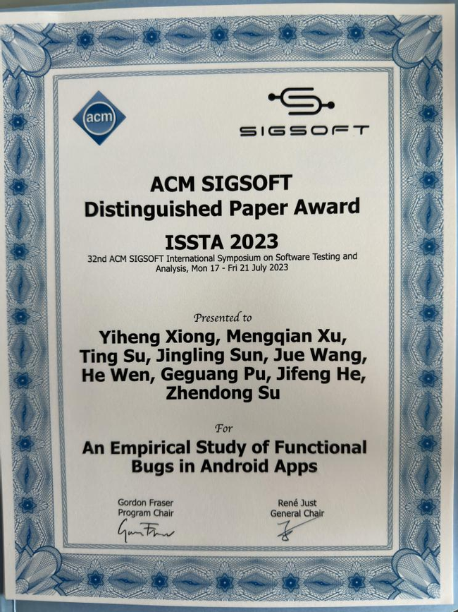 近日,软件工程领域国际学术会议ISSTA 2023 (International Symposium on Software Testing and Analysis) 在美国西雅图召开。德赢官网Vwin博士生熊一衡对研究工作“An Empirical Study of Functional Bugs in Android Apps”做了在线报告,该工作荣获了大会颁发的ACM SIGSOFT杰出论文奖 (ACM SIGSOFT Distinguished Paper Award)。