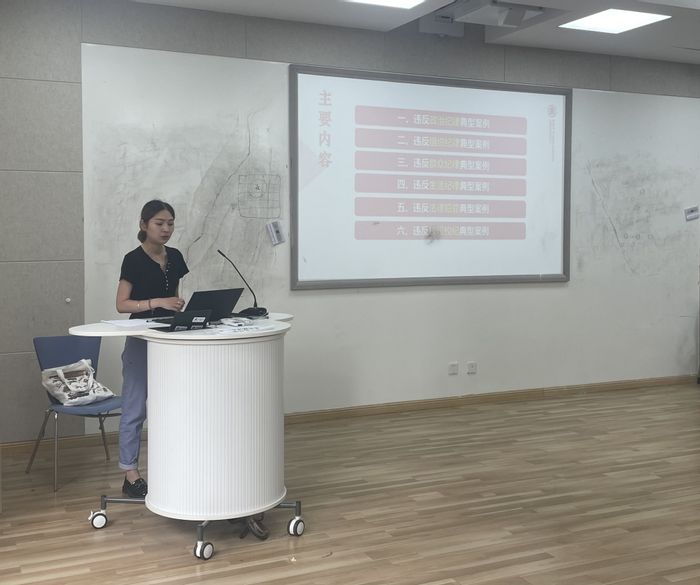 2021级专业学位硕士研究生党支部纪检委员卢雅楠通过与学生息息相关的真实案例深刻揭示了违法违纪行为的严重后果,以及对于个人、家庭和社会的深远影响,为同学们敲响了严于律己的“警钟”。
