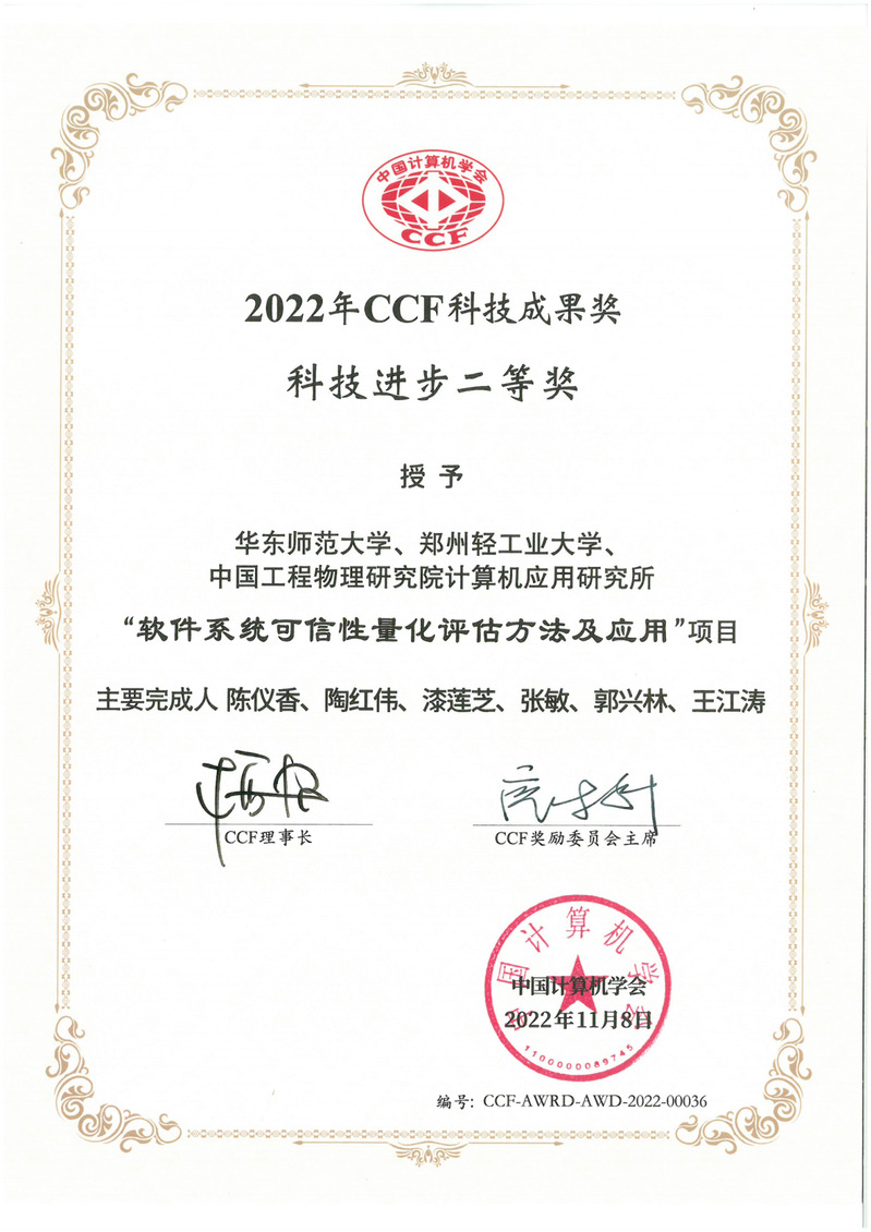 2月18日,2022 CCF颁奖典礼在北京隆重举行。典礼上颁发了2022年CCF科技成果奖,该奖授予在计算机科学、技术或工程领域具有重要发现、发明、原始创新,在相关领域有一定国际影响的优秀成果。由德赢官网Vwin骨干教师陈仪香、张敏、王江涛等合作完成的“软件系统可信性量化评估方法及应用”项目,获颁科技进步二等奖。