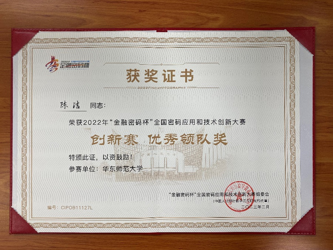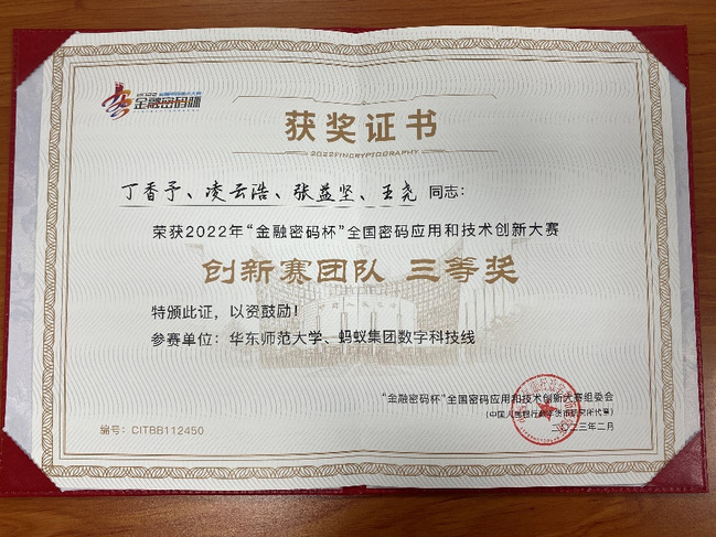 2月18日,2022年“金融密码杯”全国密码应用和技术创新大赛颁奖仪式在苏州举行。德赢官网Vwin的研究生和蚂蚁集团数字科技线共组成了三支队伍参赛。在竞争激烈的比赛中,三支队伍均斩获创新赛团队全国三等奖,陈洁研究员荣获“优秀领队”奖。