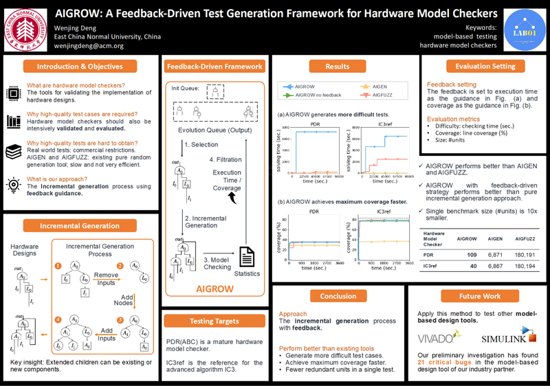 师从学院执行院长蒲戈光教授的邓文静,以“AIGROW: A Feedback-driven Generation-based Framework for Hardware Model Checkers”为参赛论文题目, 与团队成员创新性地提出了一种针对硬件模型检查器的测试用例生成方法。利用反馈引导测试用例递增生成的方法,结果显示该方法显著优于现存生成器。