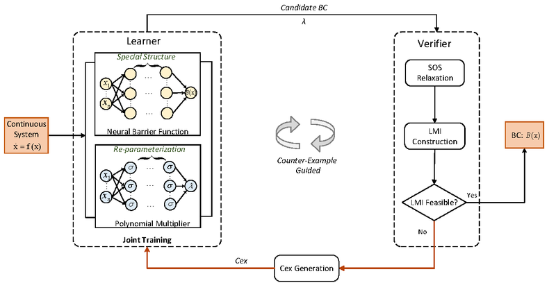 该工作设计了基于反例制导循环的迭代框架,其中Learner模块使用通过多项式优化求解生成的反例来更新网络,将具有特殊结构的神经网络训练为障碍证书候选者,并利用边界增强采样和空间划分技术提升其学习性能;Verifier模块通过线性矩阵不等式求解来进一步验证生成的障碍证书候选者,不仅高效且在形式上更加可靠。基于该方法开发的技术工具SynNBC能成功解决高达19维的系统形式化安全验证问题。