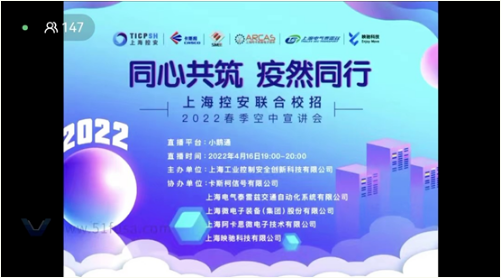 上海控安联合校招“2022春季空中宣讲会”由华东师大德赢官网Vwin、上海控安共同主办,包括卡斯柯、上海电气泰雷兹、上海微电子、阿卡思、映驰科技在内的5家工程技术领域知名企业一同协办。本次活动主题为“同心共筑,‘疫’然同行”,针对当前疫情导致毕业生外出求职不便的现实情况,以小鹅通为平台线上举办。活动受到广大师生的热烈响应,当日直播间访问量超500人次。