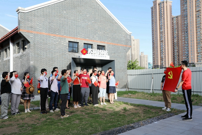 在苏州河2号滨河绿地,伫立着一幢青砖红瓦的复古老房子——苏河水岸驿站·长风湾。党员教师步行至此,感受到驿站“还岸于民、还水于民”的开放姿态和人文关怀。作为“我为群众办实事”的实践活动之一,驿站秉持的“文化苏河、乐享苏河、畅游苏河、休闲苏河”设计理念以及为来往群众提供的便民服务,深刻体现了以人民为中心的发展理念,体现了党为人民服务的根本宗旨。在驿站前的空地上,党员教师面向党旗,举起右拳,重温入党誓词。