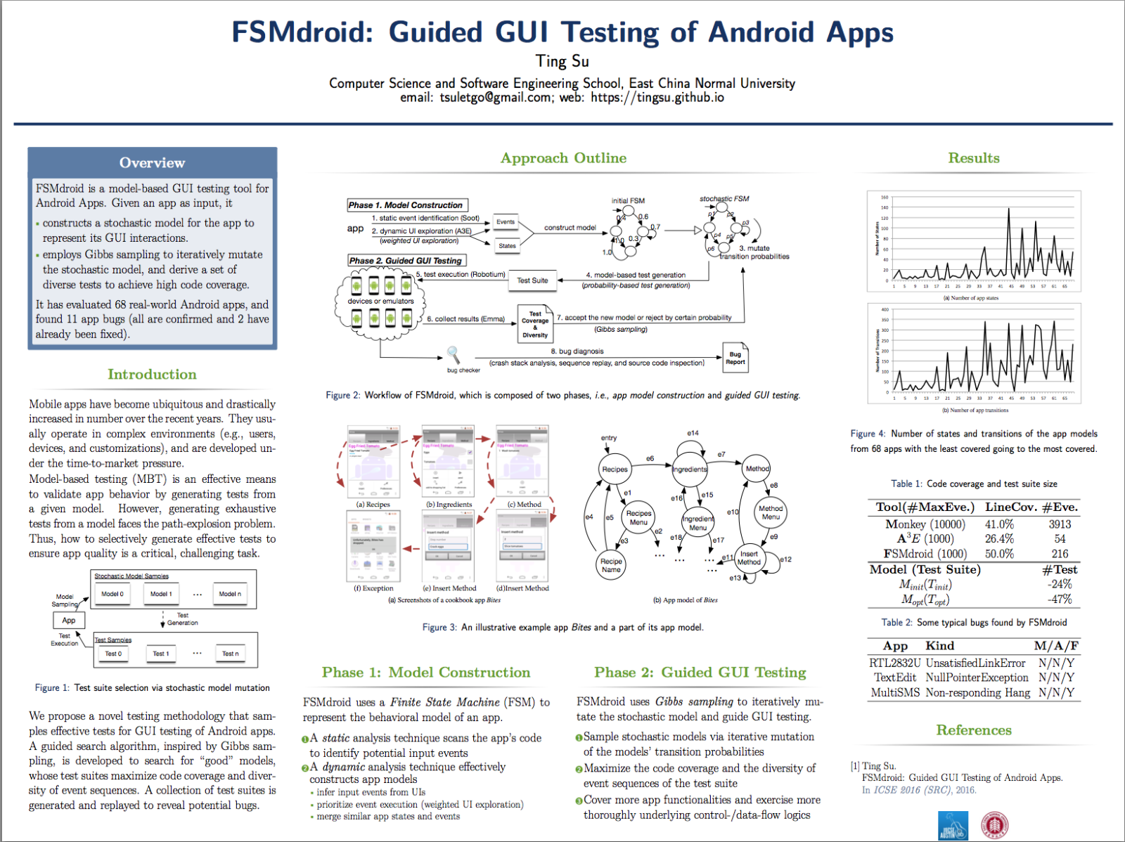 苏亭师从何积丰院士和蒲戈光教授,曾在美国UC Davis大学Zhengdong Su教授的研究团队中访问学习一年。他在国际顶级学术会议ICSE、PLDI 上发表过多篇学术论文,曾获学院首届“学生杰出青年”称号。他本次参赛的论文题目为“FSMdroid: Guided GUI Testing of Android Apps”,创新性地提出了一种针对安卓应用程序的自动化测试技术,他与团队成员研发的测试工具FSMdroid能够完全自动化地对安卓应用程序进行深度测试,目前已经检测出了安卓应用程序的10多个漏洞,并均已得到应用程序开发者的确认和修复。