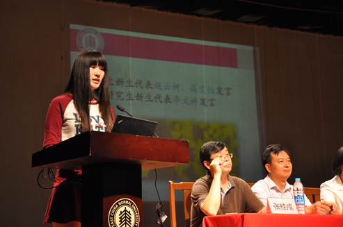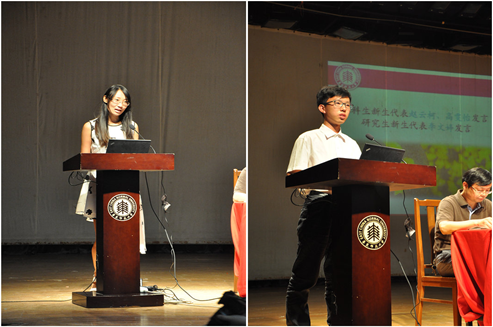 接着嵌入式软件与系统系主任陈仪香作为教师代表致辞。老师抛出了三个问题:“我们是否长大” “老师你在哪里”“为何是上大学”,并由此向同学们介绍如何过好大学生活。学生代表也给我们带来了振奋的激励和美好的祝愿。计算机系新生代表赵云柯告诉同学们:“慎独”“沉淀”。软件工程新生代表高雯怡认为我们要在青春的时期,用新的斗志,把握自己;用优秀的大学,来磨砺自己。研究生新生代表李文婷肯定了华师的魅力,她鼓励研究生们确立目标,不是目光短浅地只关注文凭与工作。