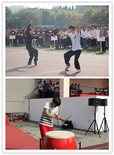 在李书记宣布运动会开幕后,教职工和学生们分别带来了精彩的表演。老师们身着蓝色运动服,为我们带来了动作规范、整齐的广播体操表演;14级同学的一套武术表演一下子抓住了所有人的眼球,刚劲有力的拳术、轻快潇洒的剑术和勇猛灵活的棍术让同学们连连叫好;紧接着,15级同学也进行了舞蹈表演,他们用活泼可爱的动作把快乐传递给大家,令人忍俊不禁。开幕式的最后,院党委副书记洪燕老师宣布了入场式各方阵的得分, 12级联队以一套行进间完美转体的创意获得了开幕式队列的第一名。