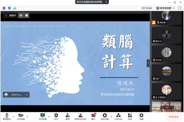 陈闻杰副教授代表重点实验室为听众作题为“类脑计算”的科普讲座。讲座以手指月,带大家了解类脑计算的粗浅概貌,介绍人工智能、生物大脑、类脑计算、脉冲神经网络等概念,了解意识与记忆粗浅机制、类脑计算的实现途径和典型应用等。