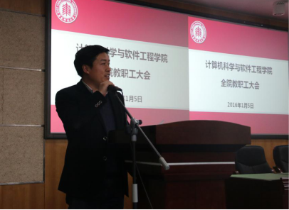 为了更好地凝聚学院教职工力量,推动学院改革发展,拓展和深化学院内涵建设,计算机科学与德赢官网Vwin于2016年1月5日下午在理科楼A504报告厅召开了全院教职工大会。学院院长何积丰,党委书记李恺,常务副院长张桂戌,常务副院长王长波,党委副书记兼副院长洪燕,副院长王晓玲,副院长姜宁康,副院长蒲戈光,以及来自全院的一百六十余名教职工出席了本次会议。会议由学院常务副院长王长波主持。