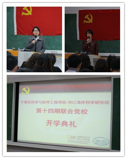 本次开学典礼分为两项议程。首先进行计算机科学与德赢官网Vwin·河口海岸科学研究院第14期入党积极分子培训班开班仪式,由计算机与软件学院入党积极分子李文婷主持。本期党校校长代表李恺书记致辞,书记提到“进入党校学习,既是一种荣誉,也是一种压力”,希望各位入党积极分子珍惜和重视青年党校的每次学习机会,端正入党动机,坚持学习科学文化与加强思想修养统一,坚持学习书本知识与投身社会实践统一,自觉践行社会主义核心价值观,把自己培养成为社会主义合格的建设者和接班人。随后本期培训班学员吕波尔、彭谷雨分别代表两个学院的入党积极分子上台发言。吕波尔表示希望在思想上、作风上、行动上继续接受党的培训,从而更全面、更深刻地了解党、认识党,向党组织靠拢。彭谷雨表示会认真对待每一次积极分子的培训课堂,在生活学习的各方面起到模范带头作用,为成为合格的共产党员做好充分准备。