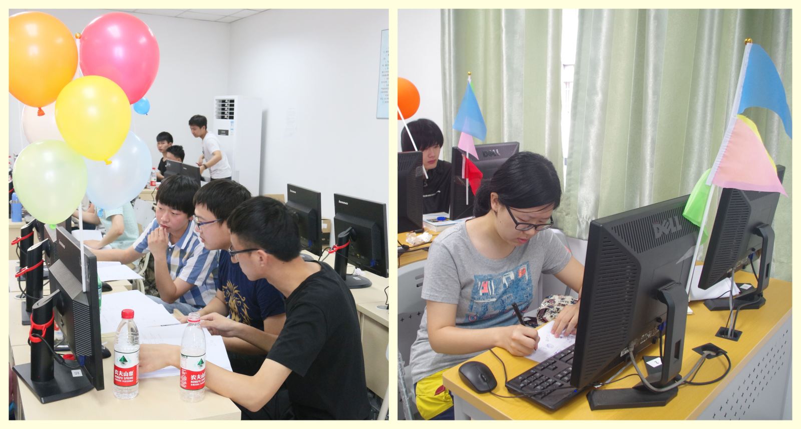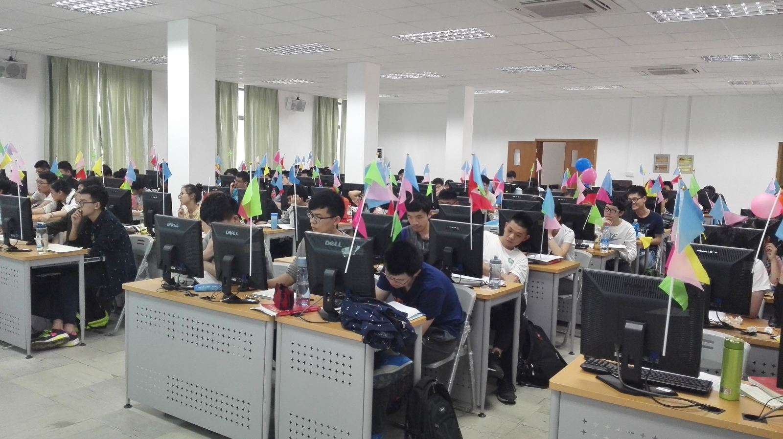 下午12点30分,ACM的在线评测系统上“热身赛”栏目被点亮,同学们开始赛前热身,个个摩拳擦掌,跃跃欲试。13点30分,比赛正式开始。本次比赛分为高年级组组队程序编程竞赛和15级组专业实践能力测评竞赛。比赛期间,15级每位同学使用1台电脑需要在四小时内使用计算机语言编写程序以尽可能多地解决给出的问题。答题不分先后,题目重点考察选手的算法和程序设计能力。在每位正确完成一题后,组织者将在其位置上升起一面彩色的旗帜。而高年级则三人组成一个小队,在四小时内用计算机语言编写程序以解决问题,正确完成一道题后,将升起一个气球。随着赛程的进行同学们桌上旗帜与气球颜色越来越多,气氛也越来越紧张,在比赛开始一个半小时候逐渐进入了白热化。难题开始出现,要想再获得旗帜变得不再那么容易。但与此同时,也有少数选手状态渐入佳境,升起的旗帜数量开始增加。在接近比赛的尾声,2015级蒋承旭同学完成了最多题目,座位旁一片旗帜与气球,引来同学们的一片惊叹。