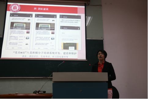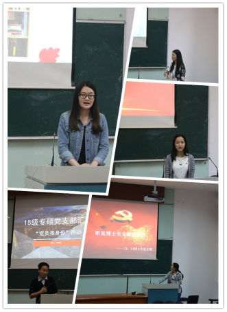 随后,就“我是一名入党积极分子”亮身份活动各积极分子小组进行汇报。本次亮身份活动,各位入党积极分子以“优雅校园,绿色生活”为主题,结合各自的学习、生活等实际,在所在班级、寝室、实验室开展了丰富多彩的活动。如2015级计科小组就向所在班级发出手机离开桌面的倡议,建议各位同学将手机收进书包,上课的时候不看手机或者不带手机。各小组纷纷表示感受到自身的责任所在,通过本次亮身份专项活动,更能让大家自觉践行一名入党积极分子在学习、生活和工作上起到先锋模范作用。参加本次汇报的,还有计算机科学与德赢官网Vwin的各党支部。如2015级学术硕士第二党支部结合本次党员亮身份的活动,组织本支部的入党积极分子和党员在数学馆进行为期一个月的自行车摆放志愿服务行动,受到了师生一致好评。此外,2012级本科生党支部、学院博士生党支部的党员们从毕业生的角度给各位入党积极分子带来了学习、生活、科研等各方面的建议和寄语。