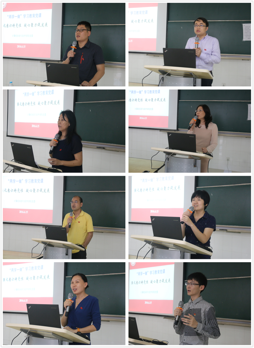 最后,学院计算机系党支部书记孙仕亮、软件工程系党支部书记彭超、嵌入式系党支部书记曹桂涛、计算中心党支部书记朱敏、数据科学系党支部书记金澈清、密码安全系党支部书记王高丽、管理党支部书记谢书玲、学生党支部书记代表周士靖就各支部开展的“两学一做”学习教育情况进行了交流。