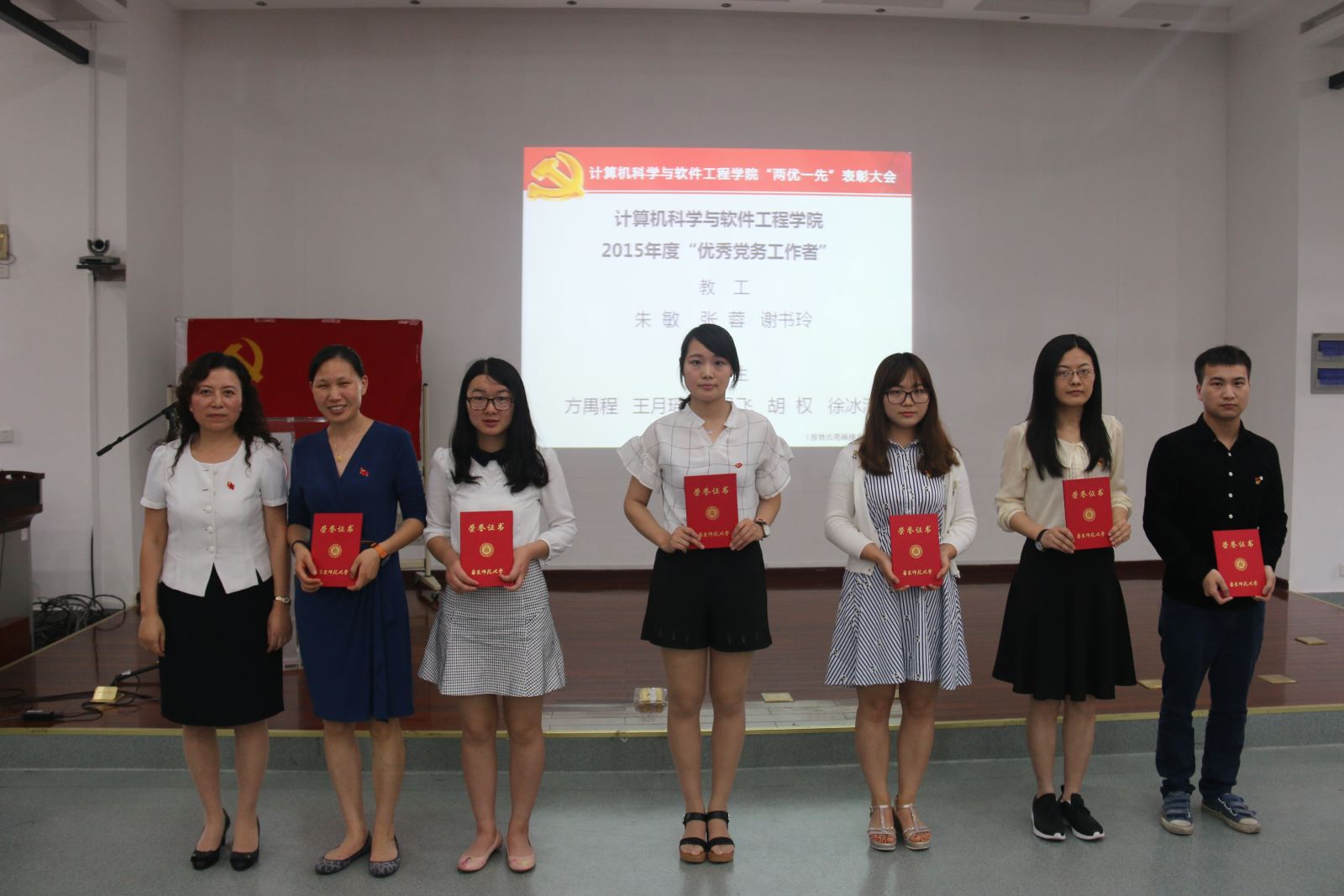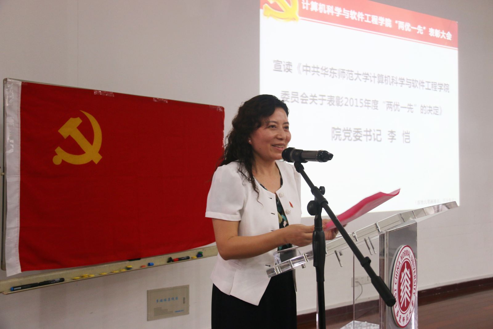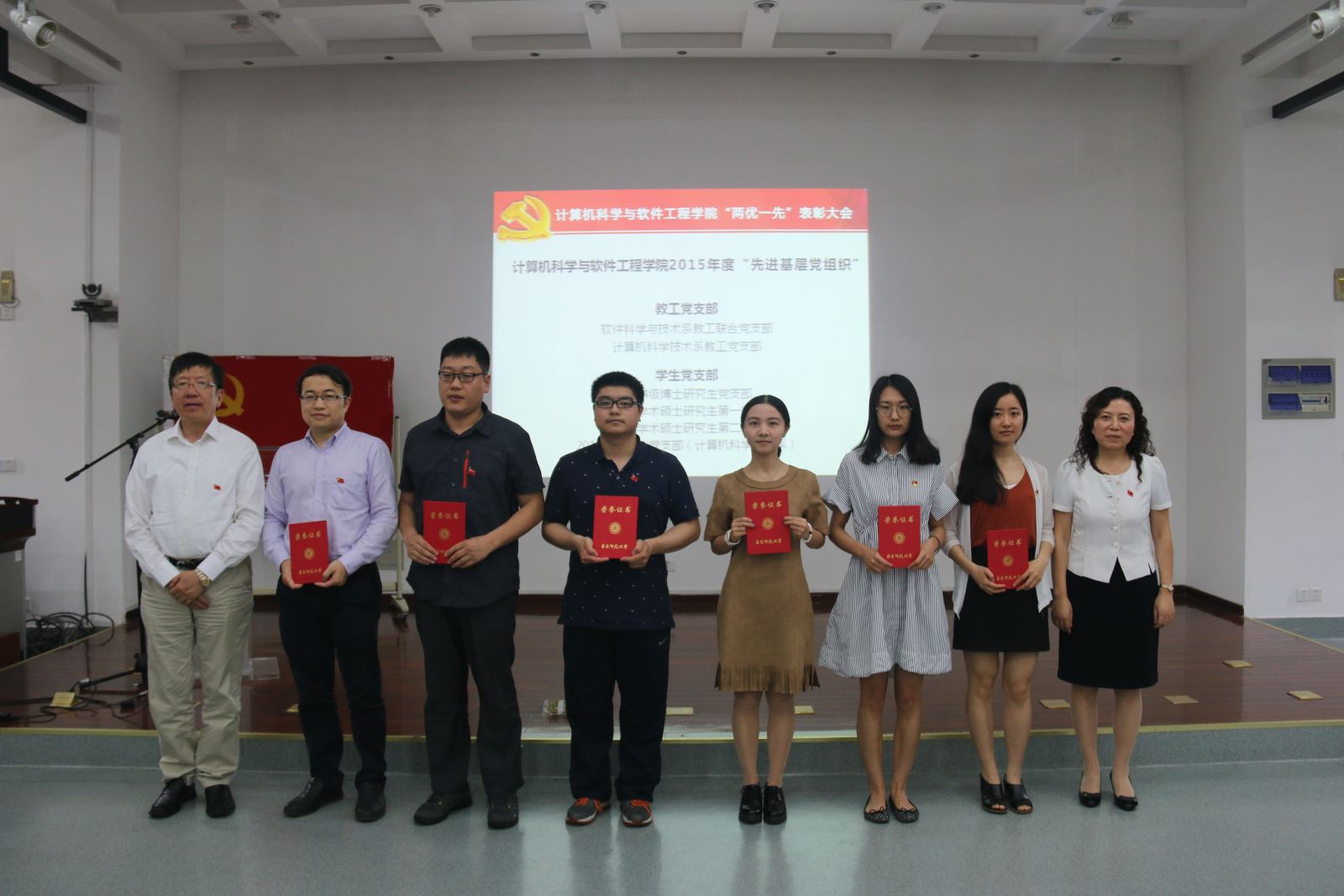 会上,李恺书记宣读了学院党委2015年度“两优一先”表彰决定,授予张桂戌、张敏等23名同志2015年度“优秀共产党员”称号;授予朱敏、张蓉等8名同志2015年度“优秀党务工作者”称号;授予软件科学与技术系联合党支部、计算机科学技术系党支部等6个党支部为2015年度“先进基层党组织”称号。她号召全体师生党员以受到表彰的个人和集体为榜样,胸怀大局、开拓进取,助力学院改革发展取得新成绩。