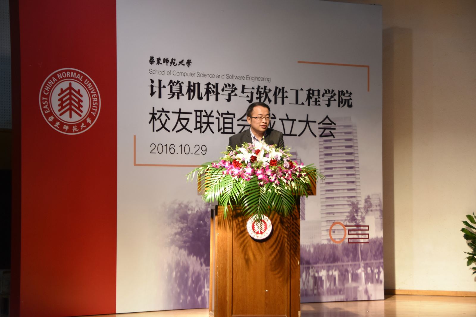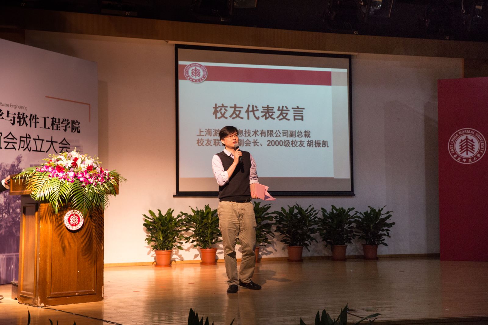 校友联谊会副会长、上海游族信息技术有限公司副总裁、2000级校友胡振凯发言,他深情回顾了在华东师大学习的经历,对学校的培养和学院老师的教诲表达了由衷的谢意。他指出,校友联谊会体现了“融合”之精神,体现在三个方面:学生与社会的融合,细分领域优势到合作的优势以及个人与团队的融合。最后,副会长胡振凯强调只有团结在一起,才能给自己,团体和国家带来机会,带来成功。