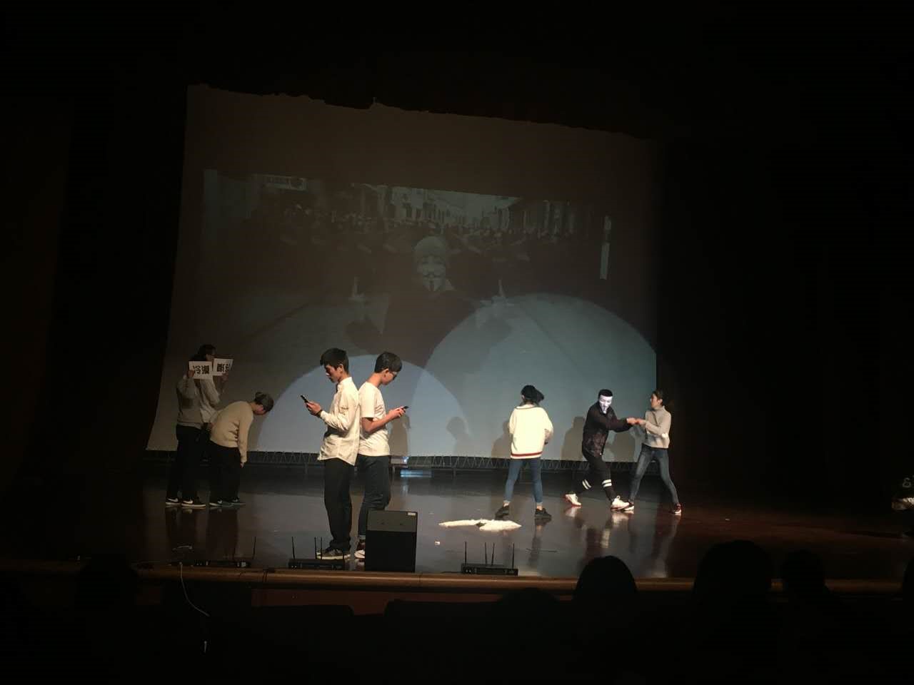 情景剧《面具》是众多情景剧之中文艺的典范,安静细腻的同时兼具理性的思考。场上表演的同学们沉浸其中,使出浑身解数,剧尾的集体舞蹈all together展示了新生的青春洋溢、阳光向上的风貌,同学们精湛的演技使在场观众赞叹不绝。