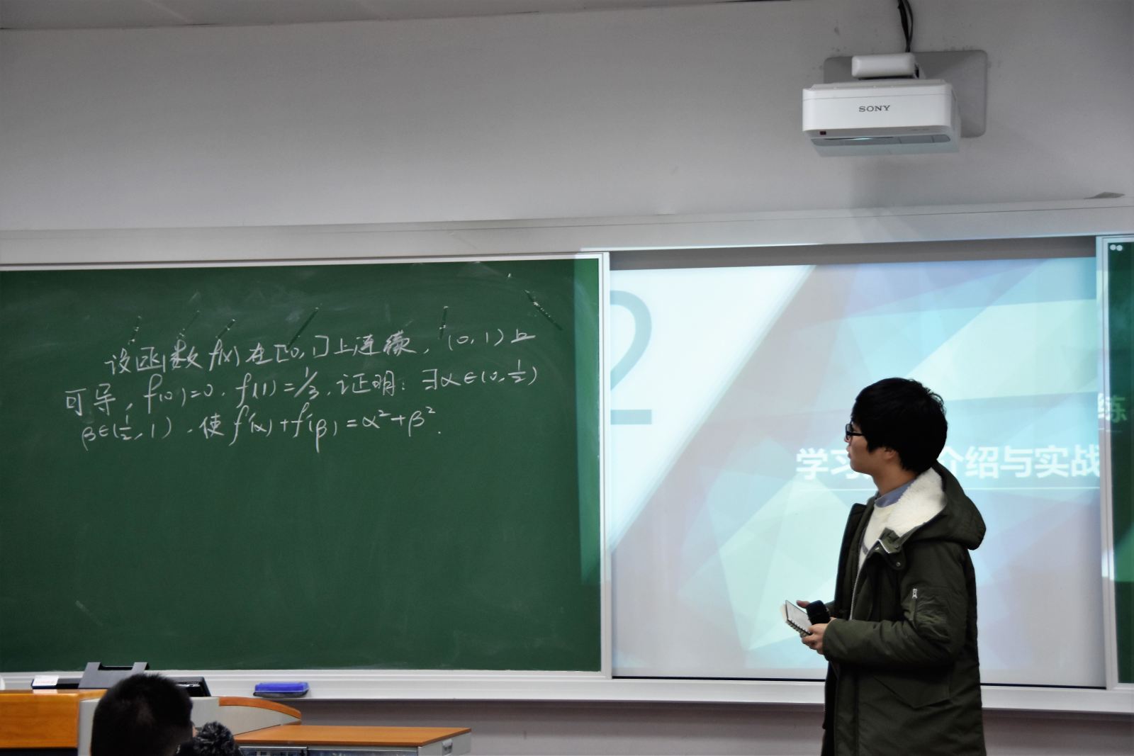沙龙伊始,三位同学逐一上台讲分享了各自学习数学的方法。曹威杰同学结合一个证明题目,对他的数学学习方法“三步走”策略进行详细解说;陈杰同学提出大学生要学会独立思考、学数学要仔细理解书本知识和认真做课后习题、理论要和实践相结合;周华驰同学以高数课后的一个习题为例介绍了数学计算的一种算法。