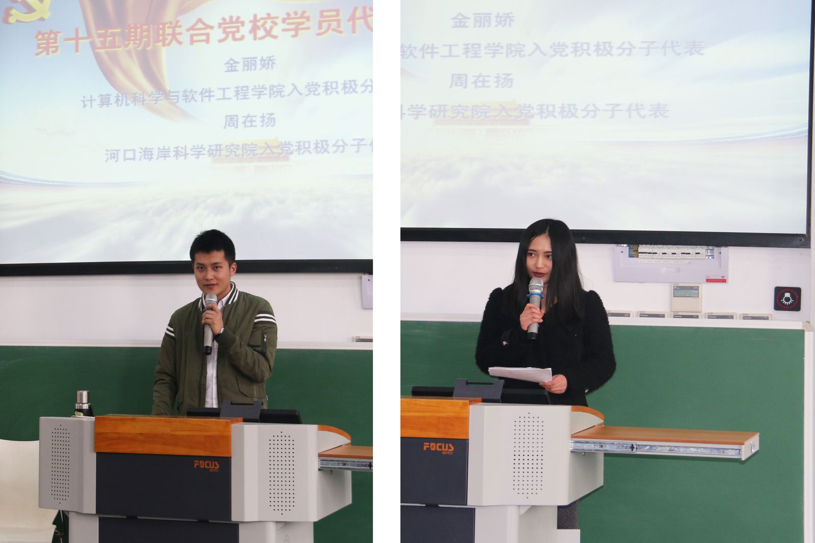金丽娇和周在扬作为学员代表分别发言,表达各自对党员精神的理解,以及对为了早日成为一名合格的党员所应该做出的努力,在日常学习以及生活实践中不断“把理想融入行动”。
