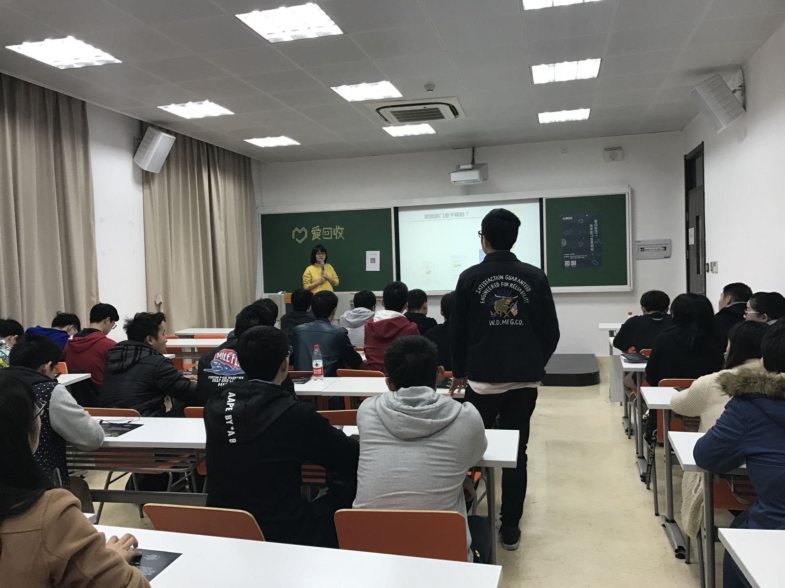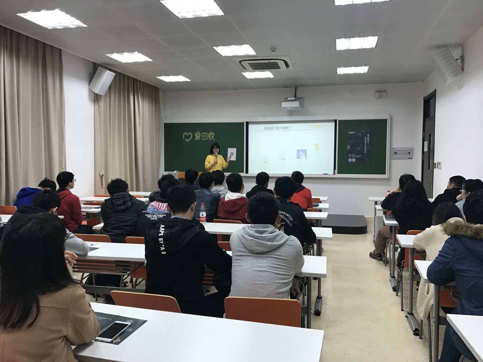 2017年4月11日晚6点半,爱回收有限公司于三馆131召开了2018届实习生宣讲会。爱回收数据部门总监吴萍、人事总监简丽娟、校招负责人陈果来到了现场,并为到场同学们准备了小礼物。来自计算机科学与德赢官网Vwin的14级同学参加了此次宣讲会。