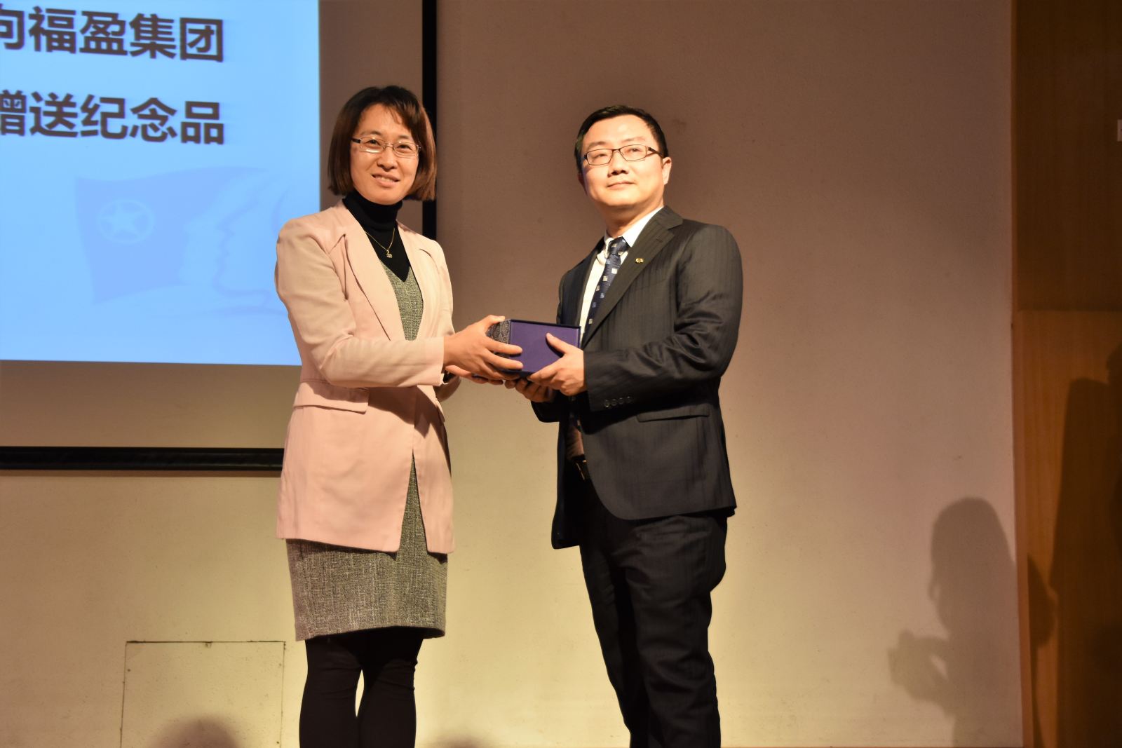 图13、学院副院长王晓玲向福盈集团赠送纪念品