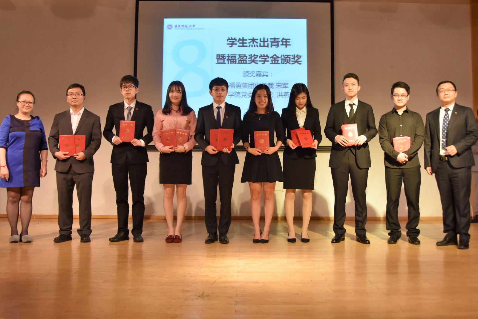 最终陈文白、陈诗韵、朱政、檀彦超、陈子溦、王路遥、周俊龙、谢斌8位同学脱颖而出,荣获“学生杰出青年”称号和“福盈奖学金”。朱柯舟、鲍勇翔、雷予斯、王晓桐、徐思远、杨乐、杨鑫林7位同学获得了“学生杰出青年”提名奖,檀彦超、陈诗韵、王晓桐三位同学获得了“最佳人气奖”。