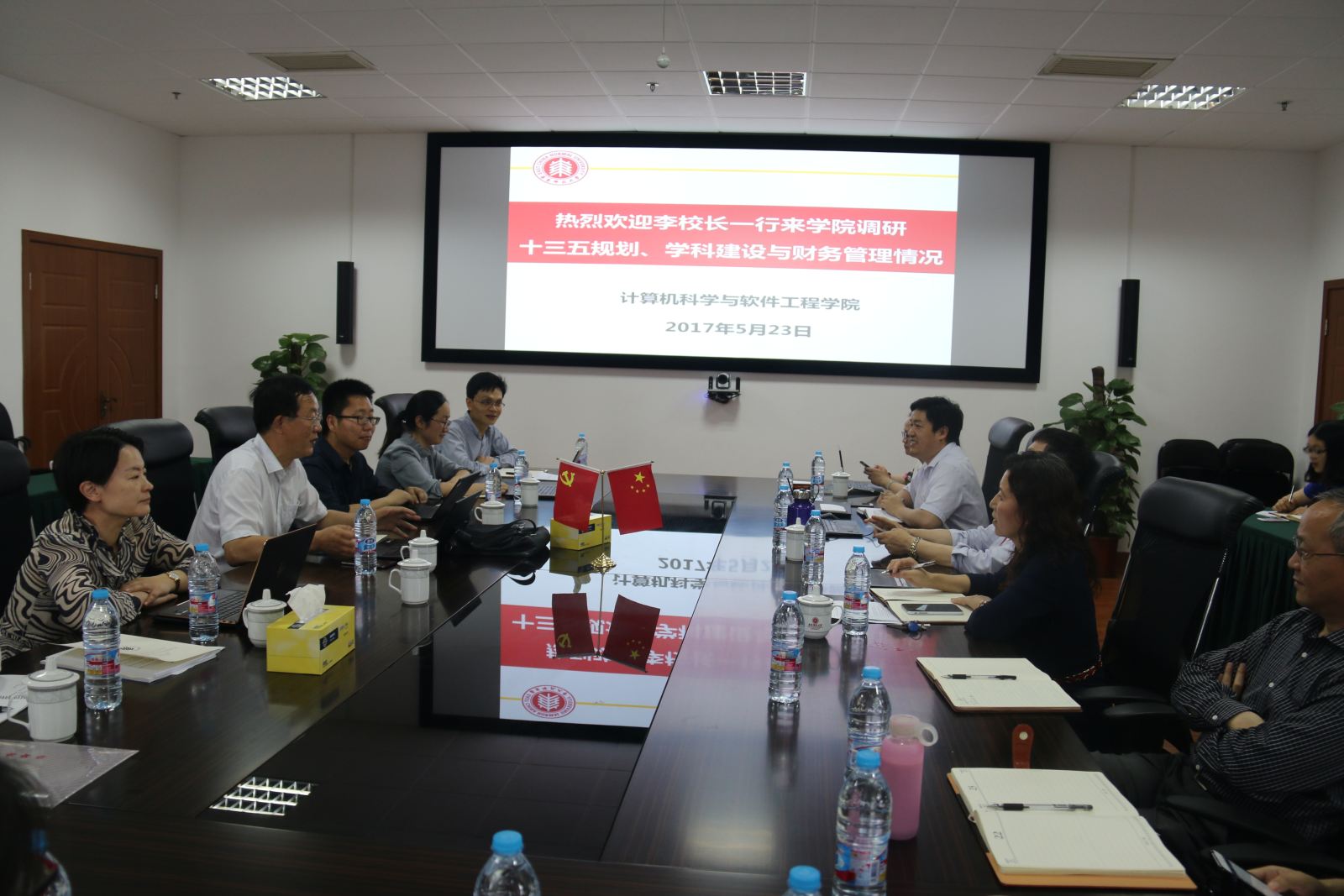 2017年5月23日,李志斌副校长携校财务处杨蓉处长、曹芳副处长、发展规划部陆智萍副部长、张绍文副部长、戴勇副部长以及相关智能部门的老师来计算机科学与德赢官网Vwin调研。学院院长何积丰院士、党委书记李恺、常务副院长王长波、副院长姜宁康、副院长洪燕、相关学科的负责老师以及财务老师参与了此次调研。李志斌副校长首先说明了此次调研的目的是考察学院“十三五”规划落实情况、新一轮学科建设、财务管理等过程中遇到的困难和问题。