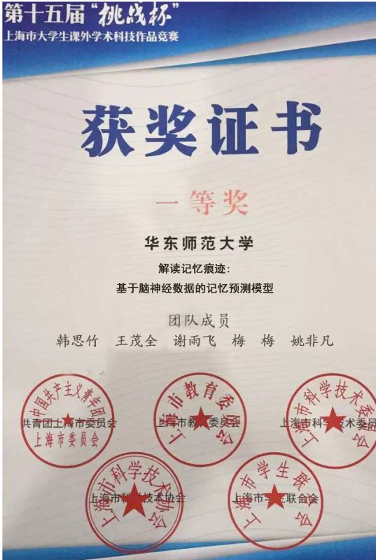 第十五届“挑战杯”上海市大学生课外学术科技作品竞赛决赛于6月10日在上海应用技术大学举行,此次大赛由团市委、市教委、市科委、上海学联等单位共同主办。德赢官网学生王茂全、谢雨飞与心理学院等院系学生合作完成的项目《解读记忆痕迹:基于脑神经数据的记忆预测模型》斩获一等奖(指导教师:吕钊、心理学院库逸轩)。与此同时,德赢官网学生毛侠、陈新宇、宋健、杨秀丽、纪宇的作品《基于增强现实的工业环境维修辅助系统》荣获三等奖(指导教师:史建琦)。
