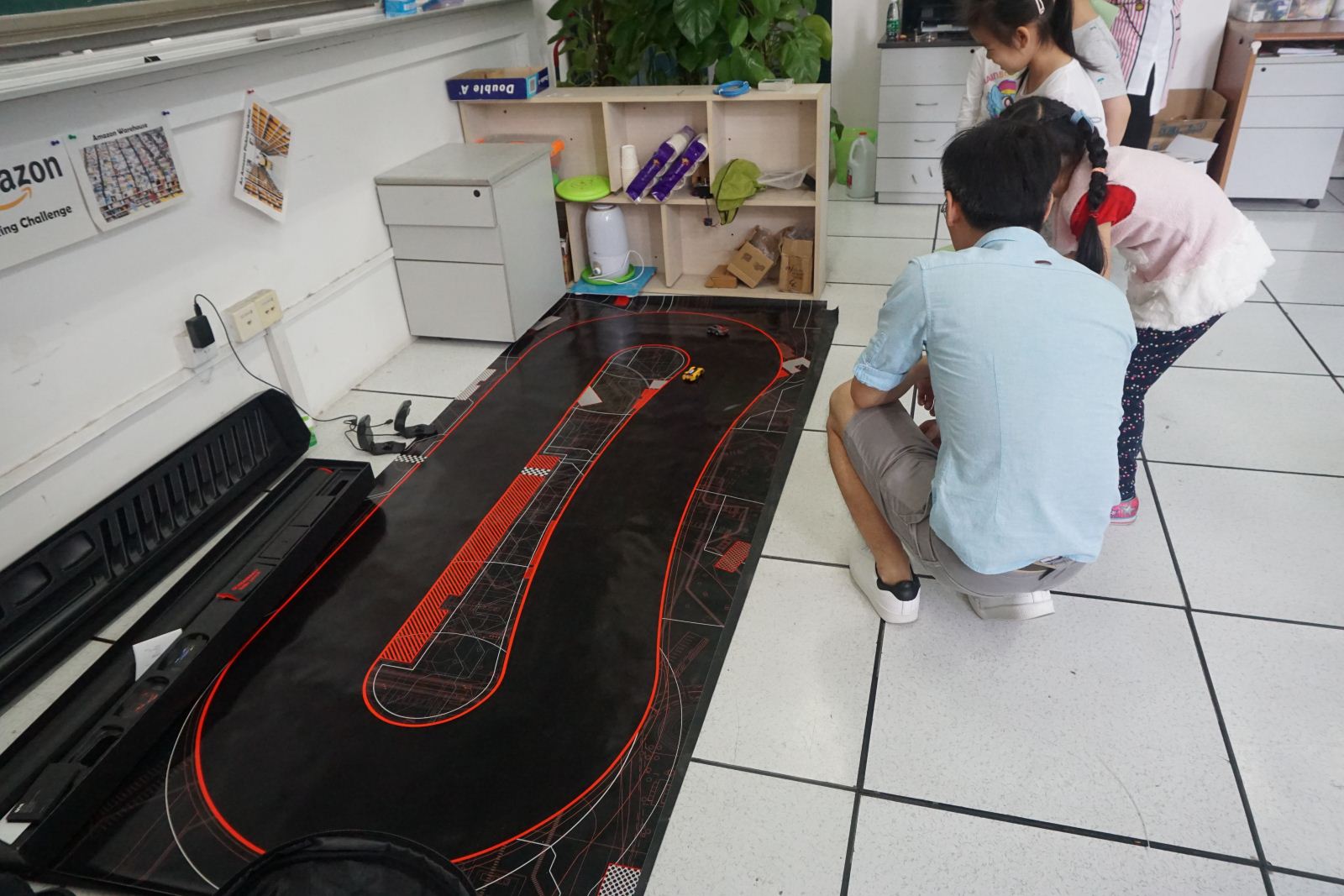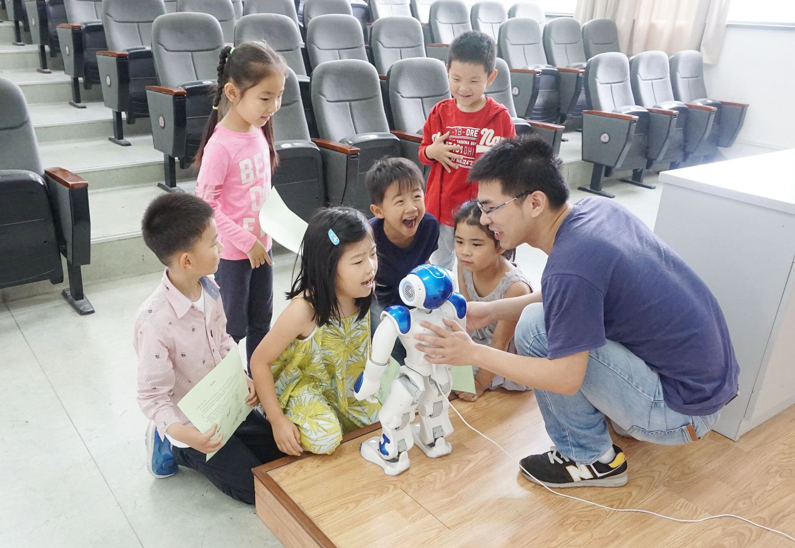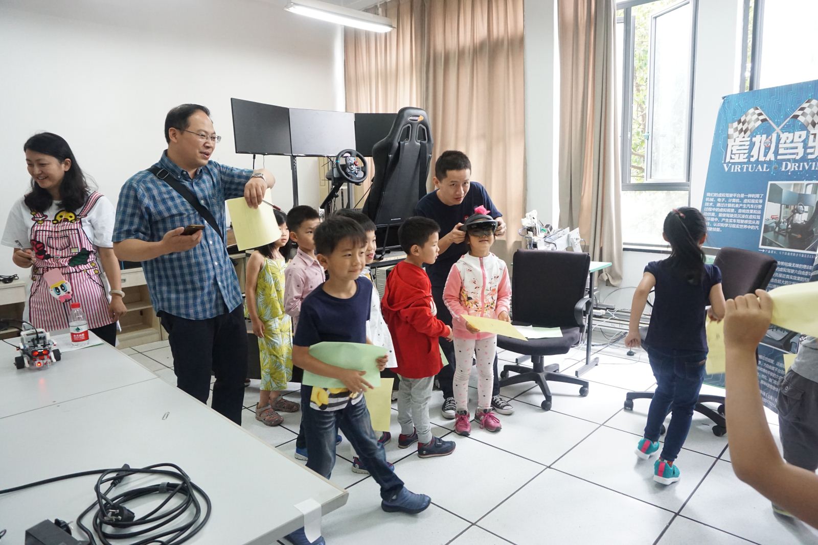 华师大附属幼儿园的100多位大班小朋友也在老师和家长的带领下慕名而来,亲身体验了NAO机器人问候、VR体验—小狗、混合现实(MR)体验—小仓鼠、跟机器人玩剪刀.石头.布、人工智能赛车展示与体验、NAO机器人表演等。