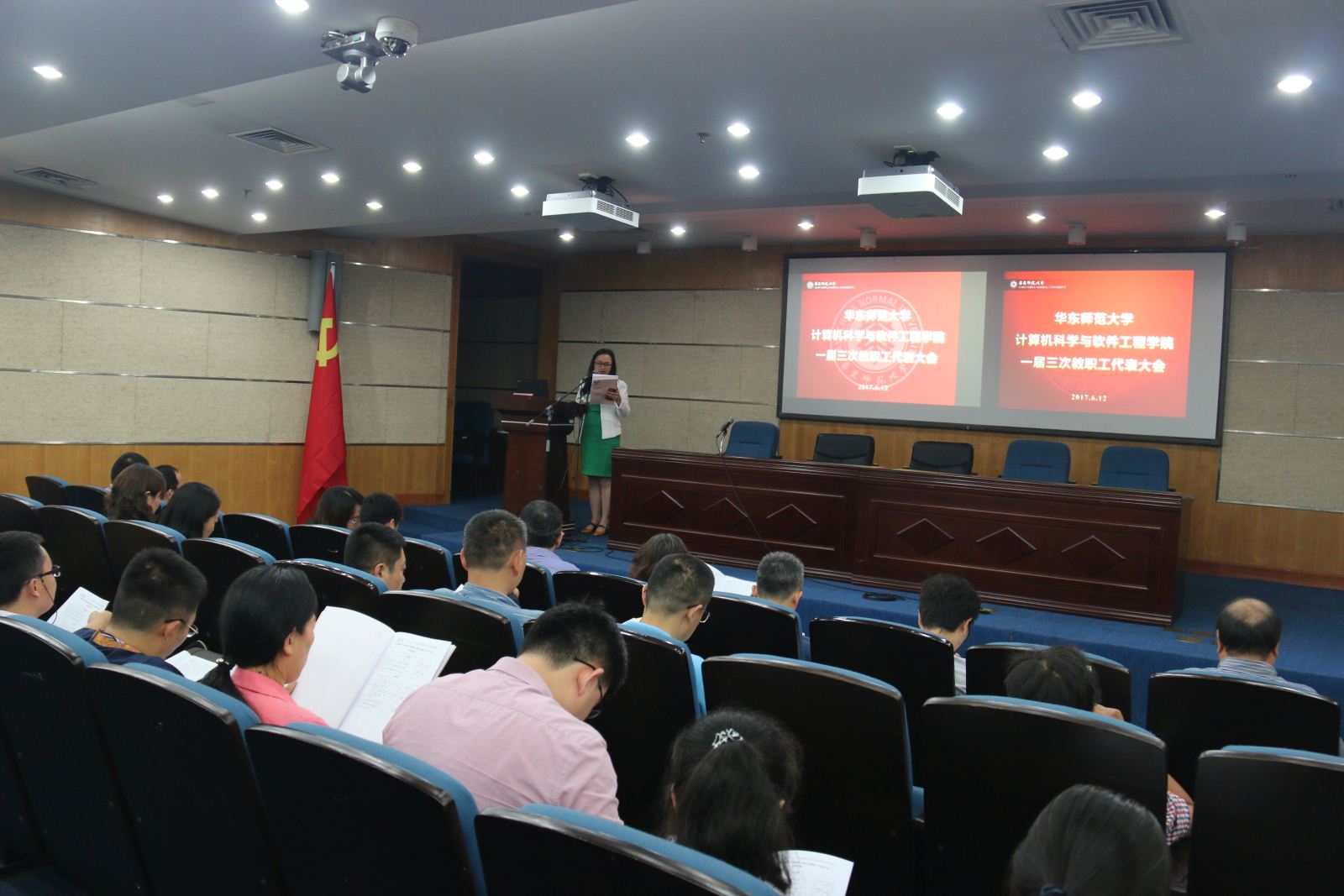 在雄壮的国歌声中,会议拉开序幕。会议的第一项议程是由院长何积丰做学部筹建工作通报,何院长介绍了目前的工作进展及工作计划。第二项议程,由学院工会副主席杨燕做工会工作报告,杨老师介绍了学院工会开展的职工小家、节日福利、春游活动、体检等与职工生活密切相关的多姿多彩的活动,丰富了文娱生活增强了职工凝聚力。第三项议程是分组讨论学院《卓越岗位管理办法》及《岗位津贴调整方案》,代表们就办法、方案的细节各抒己见,讨论热烈,提出了中肯的建议及意见。最后大会表决通过了办法及方案。
