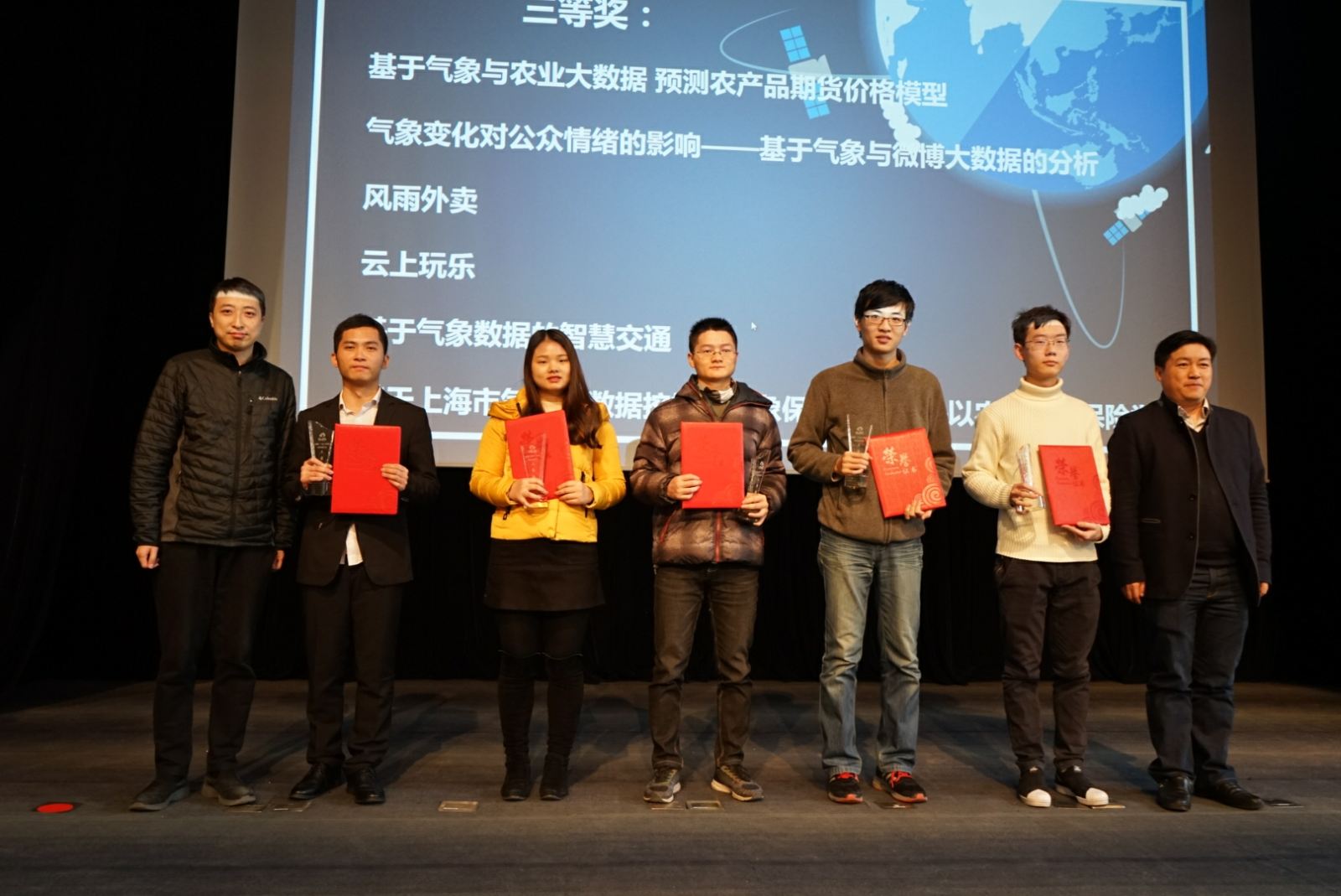 最终《触点气象:让气象触动商业》项目荣获本次大赛一等奖,《气象+健康大数据医疗平台》、《依据实时天气和位置信息的植物养成插件》和《Data-House气象大数据房屋建筑系统》荣获二等奖,《基于上海市气象大数据挖掘的气象保险方案 ——以农业气象保险为例》等六个项目荣获三等奖。