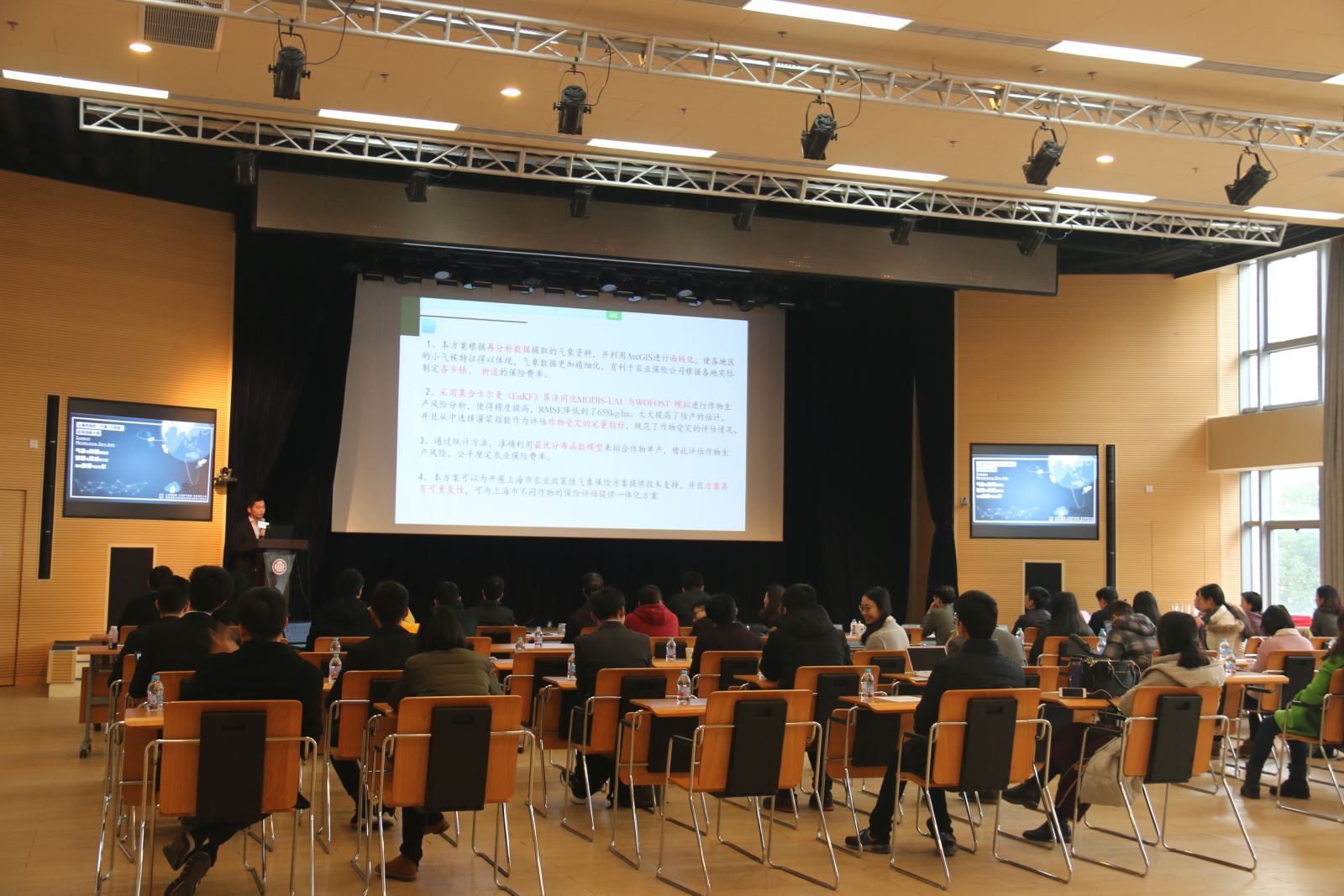 随后,进入决赛的5组项目团队进行了精彩的项目展示。第一组项目《基于上海市气象大数据挖掘的气象保险方案 ——以农业气象保险为例》提出了一种全新的保费计算模型,这一模型利用气象数据、历史灾害数据、农作物生长数据等,通过划分等级得到不同区域网格的理赔指数,以此得到上海市农作物保险费用数据。