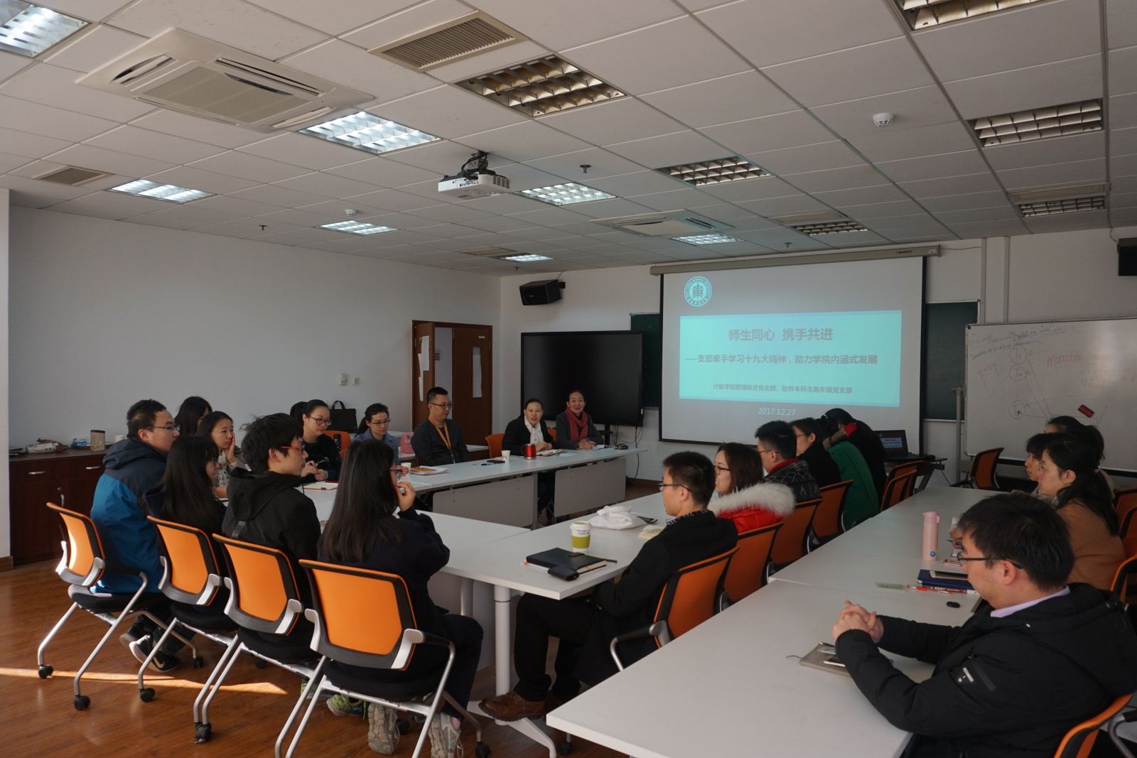 12月27日上午,德赢官网管理联合党支部与软件本科生高年级党支部在理科大楼B1002室开展“支部牵手共同学习十九大精神,实现内涵式全面发展”支部牵手民主生活交流活动。管理联合党支部书记谢书玲主持本次活动。