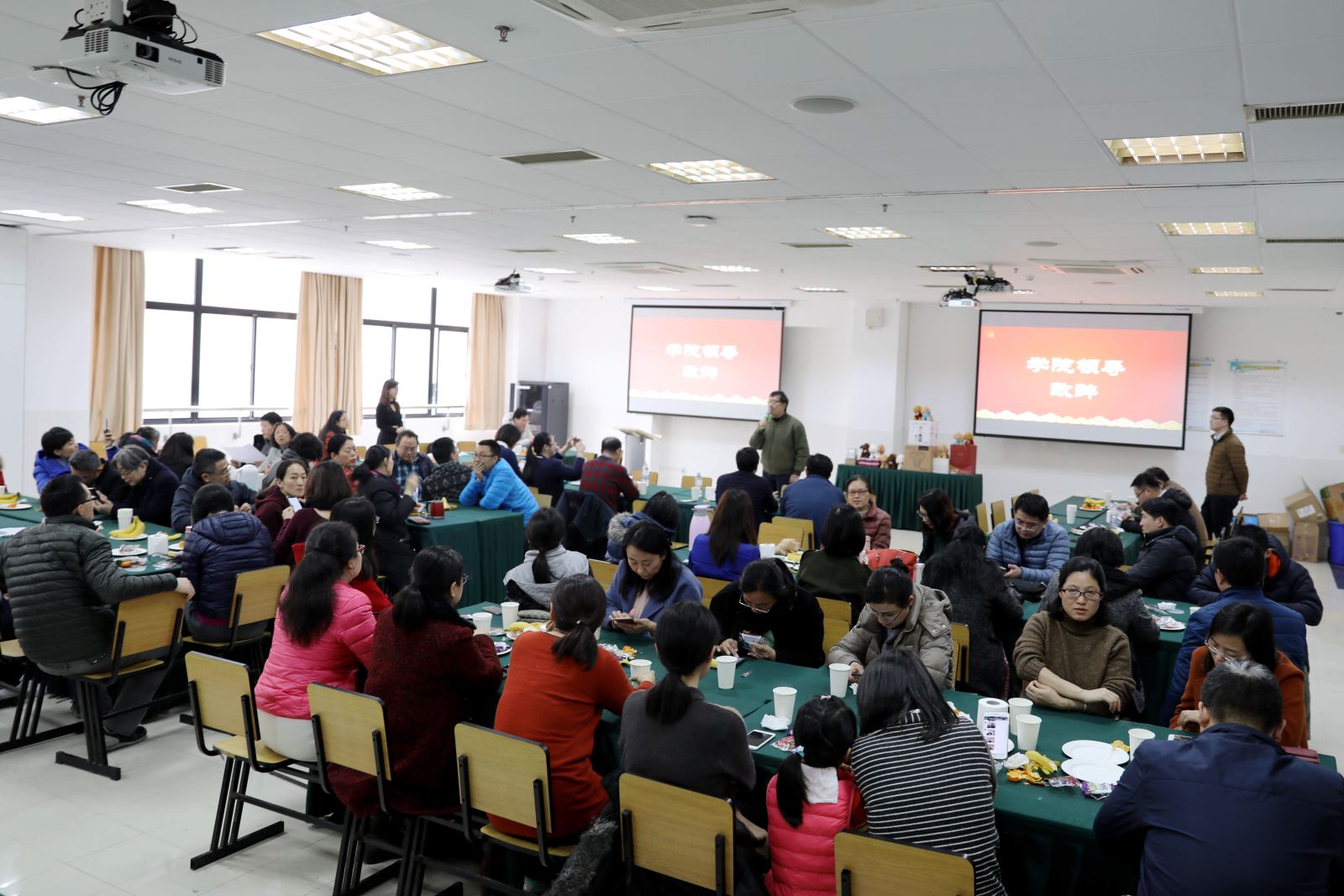 茶话会由工会委员王祥丰和杨燕老师共同主持,全院60余名教职工济济一堂。院长何积丰院士向全院教师祝贺新年,大家一年都很辛苦,我们也取得了很多的成绩,对学校学院而言未来都充满挑战也有无限的机遇,希望大家能继续不忘初心共同前进,也关照老师们要保重身体,多加强体育锻炼,工会也要加大文娱活动的开展频率,营造温馨和谐的学院文化氛围。