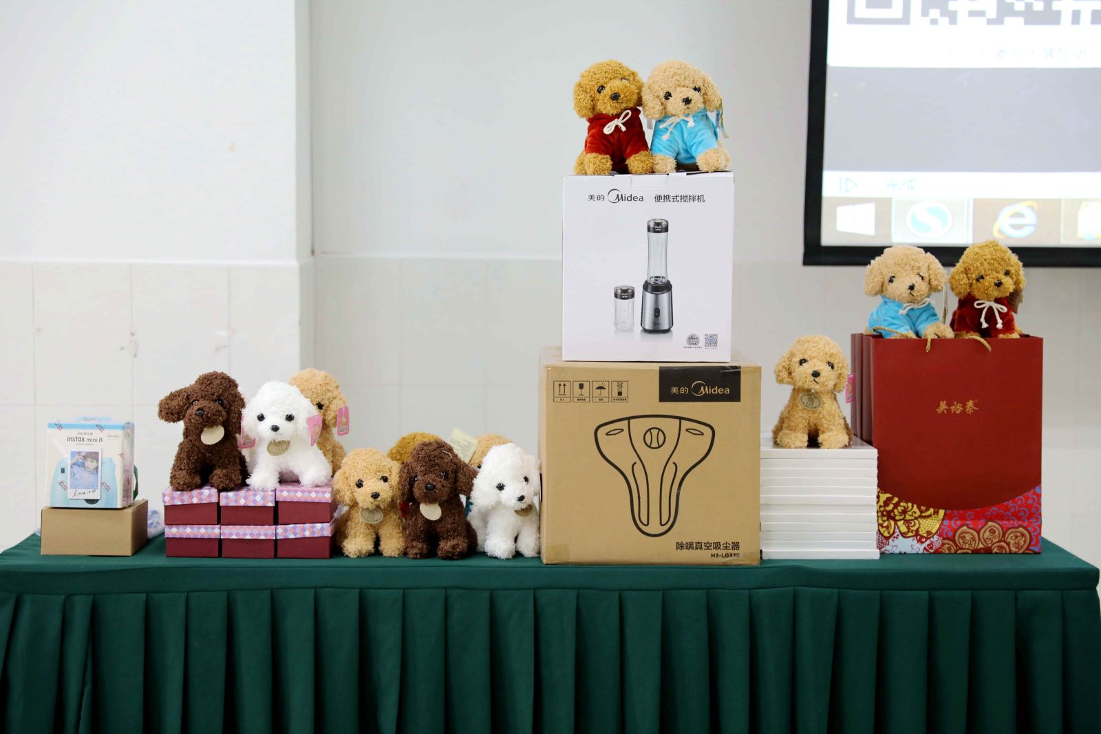 有别于以往的才艺展示,这次的茶话会,是一次新媒体的游戏盛宴,每位老师的微信头像在大屏幕闪过,有的中奖有的是游戏胜利,多媒体互动有个人项目赛跑、集体活动拔河,线下游戏有九九乘法表,大家的参与热情很高,玩的很尽兴。工会也为此次活动准备了丰厚的礼品,获奖的老师们笑逐颜开,加油鼓劲的观众们也很投入。小惊喜环节,两位去年新婚的老师还得到了特别礼物。