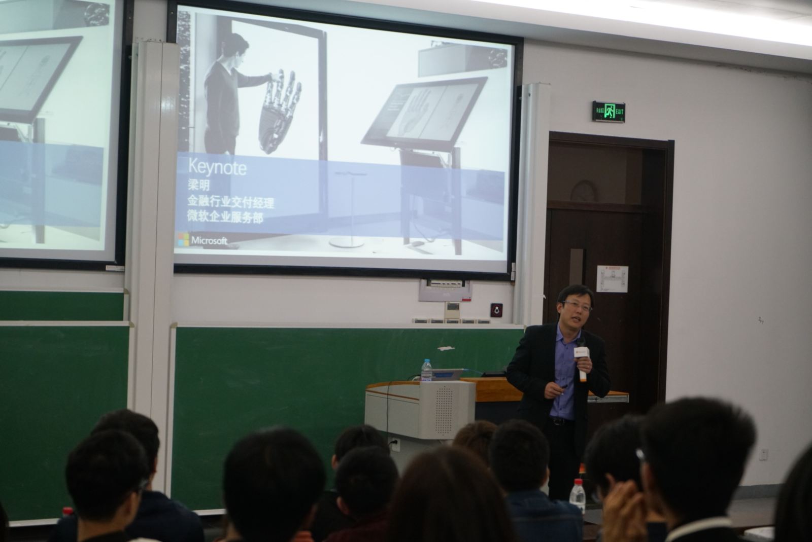 首先,97级校友梁明先生,带来了微软公司文化介绍。他在介绍中强调,微软公司在从1997年至今,始终自我革新,不落后时代脚步。同时,他通过宝贝回家等项目实例,生动地诠释了微软的使命——“予力全球每一人,每一组织,成就不凡”。并就 windows系统的装机量、公司女员工产假周数等方面的8个问题为大家进行详尽讲述,体现出微软不仅是一家专注技术的公司,人文关怀也得到了微软的关注,梁明学长的精彩介绍获得了同学们的热烈掌声。
