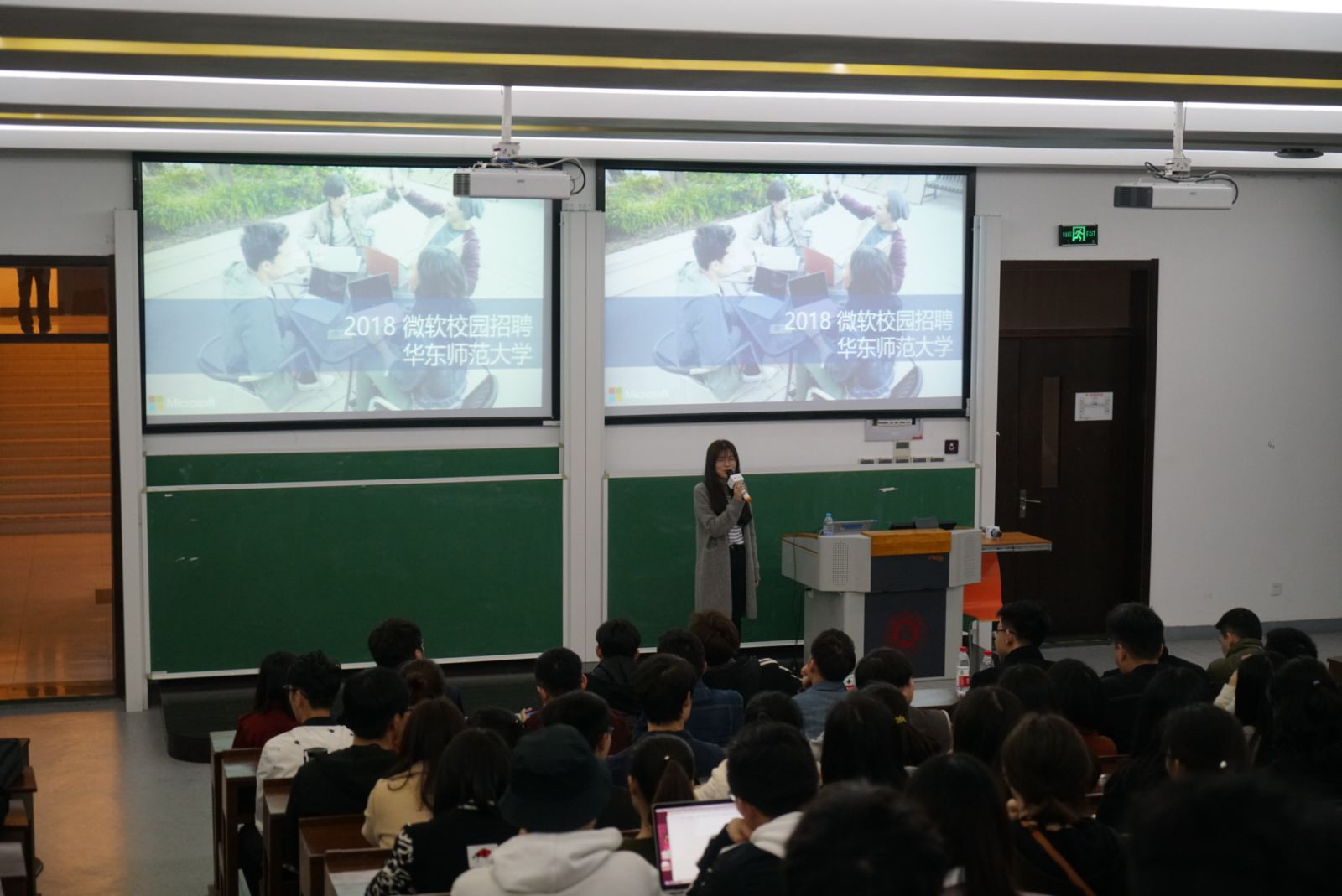 接着,微软中国校园招聘组招聘专员王一帆女士为同学们介绍了此次微软校招的开放岗位。校招岗位分为:亚太研发、销售市场与服务、全球技术支持中心。她也为同学们详细介绍了各职位具体要求、微软公司国内基地、公司员工(含实习生)培养计划及福利等方面的内容。