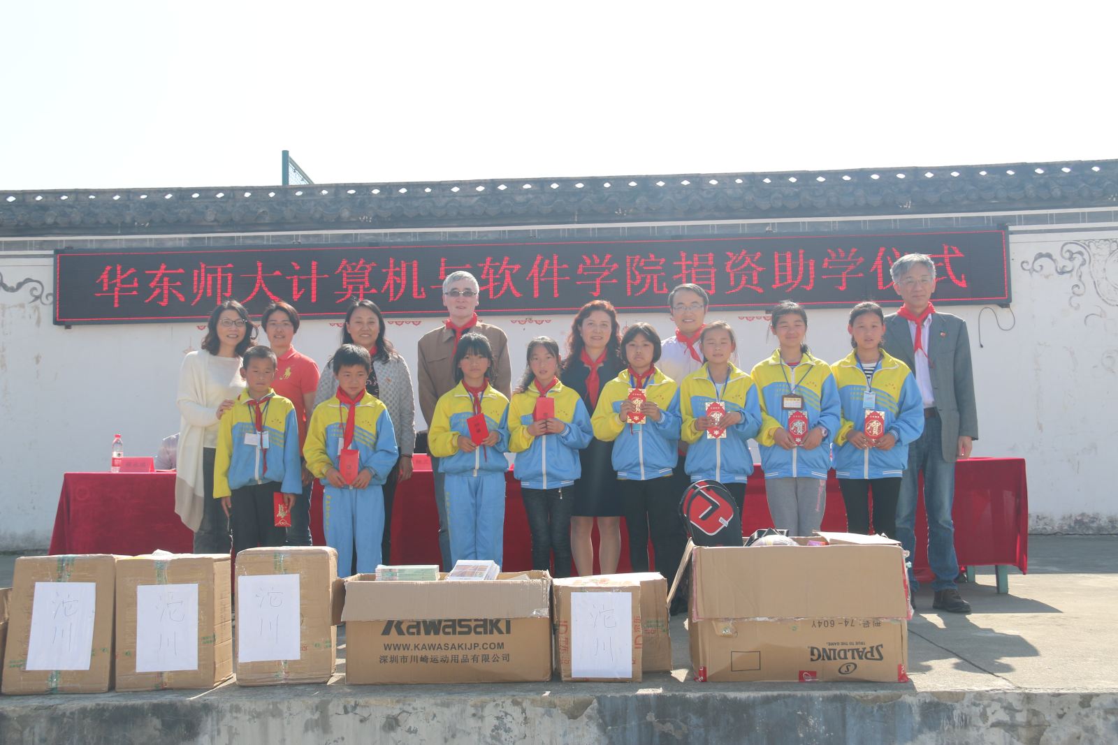活动仪式上,校合作交流办主任白勇、学院计算中心主任郑骏代表学校向沱川学校捐赠电脑80台;学院党委书记李恺、副书记兼副院长曹桂涛代表学院向沱川学校捐赠了15个教室图书角和一批图书与体育器材。另外,学院软件工程系党支部与沱川学校25名困难学生进行师生结对,党支部书记彭超等老师向结对学生赠送了捐助资金。婺源县副县长江细兰、沱川学校校长程永瑞分别致辞,表达热烈的欢迎和由衷地感谢,并鼓励同学们不辜负爱心,努力学习。