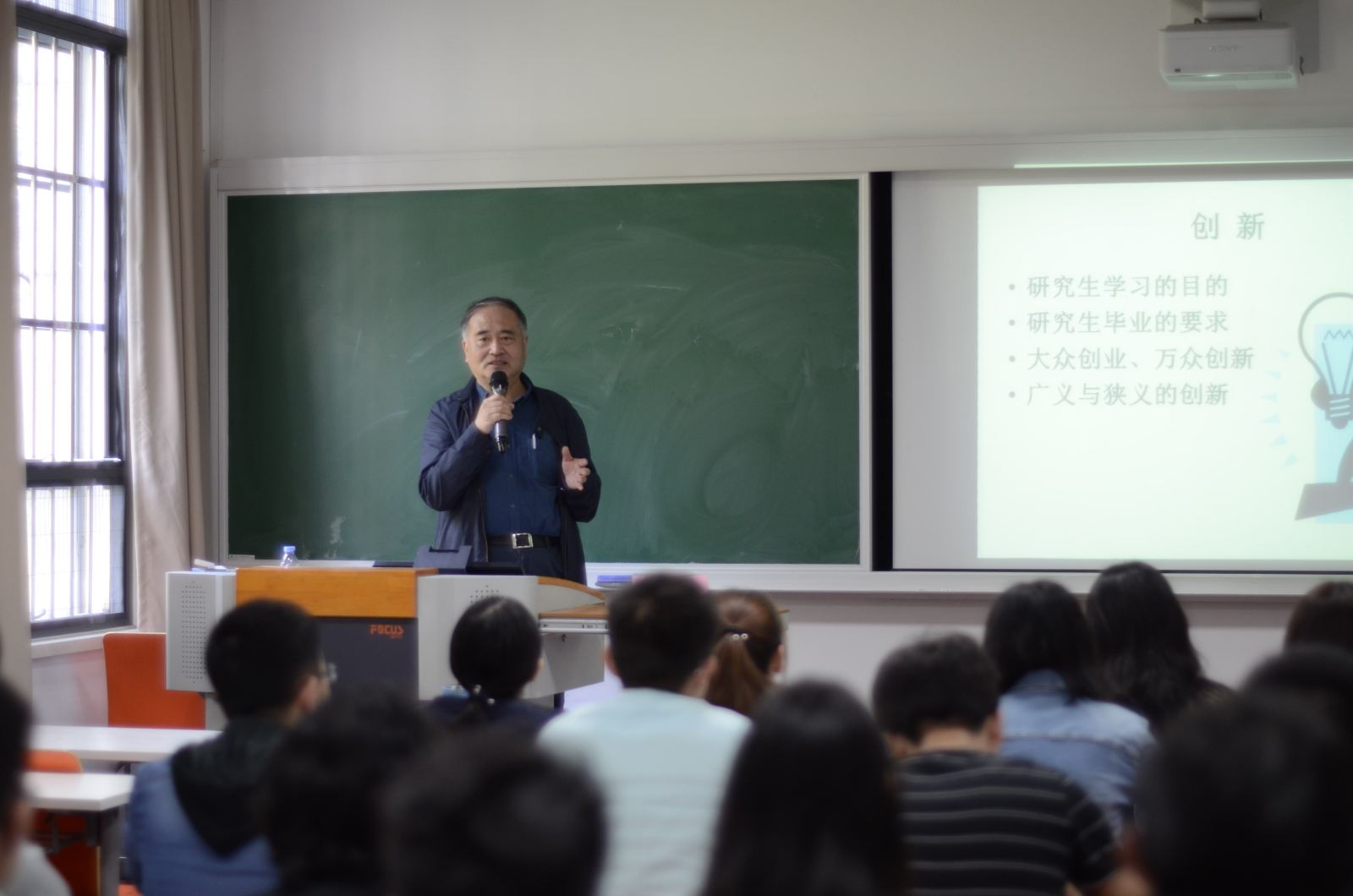 王行恒教授以科研创新为中心展开论述,强调了现在正值"大众创业,万众创新"的时代,青年大学生秉持创新精神、维护创新产品及其开发者的权益对于国家发展显得极为重要。他首先提出,研究生学习的主要目的是能够在自己的专业领域有所创新,取得突破并力争推动本专业研究的进步。
