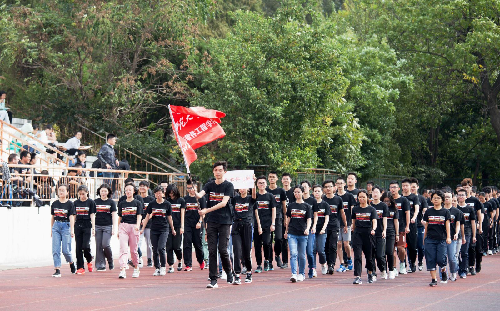 当两点的钟声敲响,开幕式正式开始。跟随着飘扬的院旗,迎面走来的是各年级同学和教工代表队组成的方阵。老师们和同学们踏着整齐的步伐向主席台走来,用响亮的口号,完美展示了计软院的精神风貌:程序圆梦,代码筑城;华师计软,无所不能!