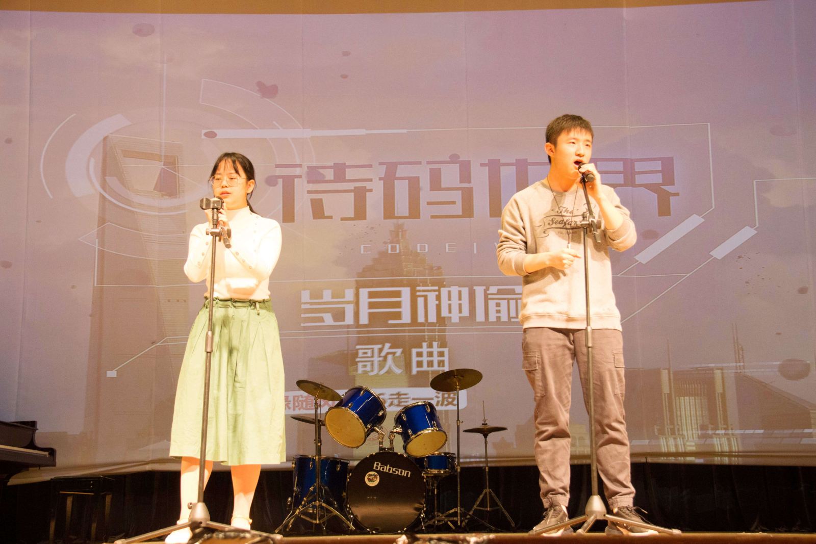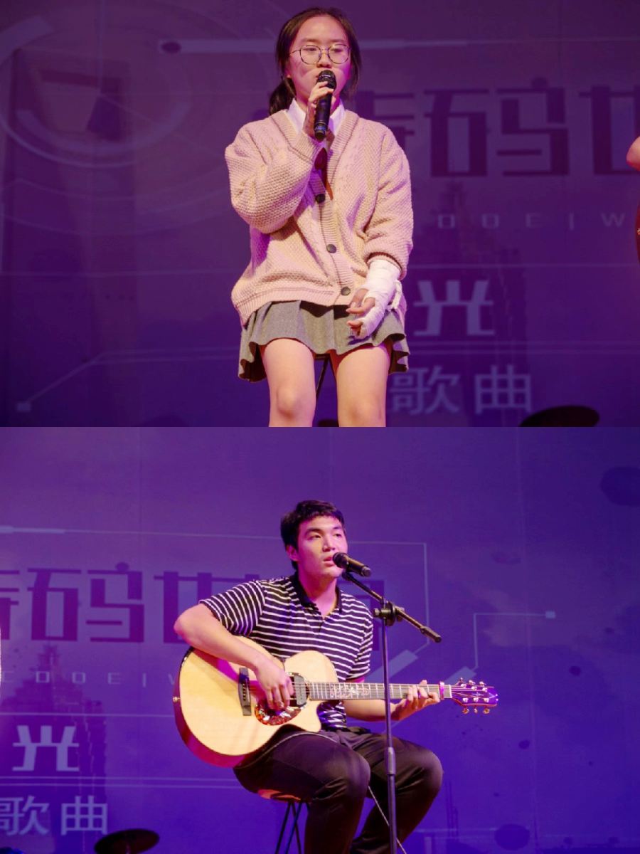 随后出场的是一首男女合唱《光》。男生和女生的声音好似天籁又相得益彰,令人沉醉其中,跳动的节奏中不乏抒情,抒情的背后又不缺美感,仿佛这小小的礼堂也成为了圣洁的殿堂,美妙温馨。