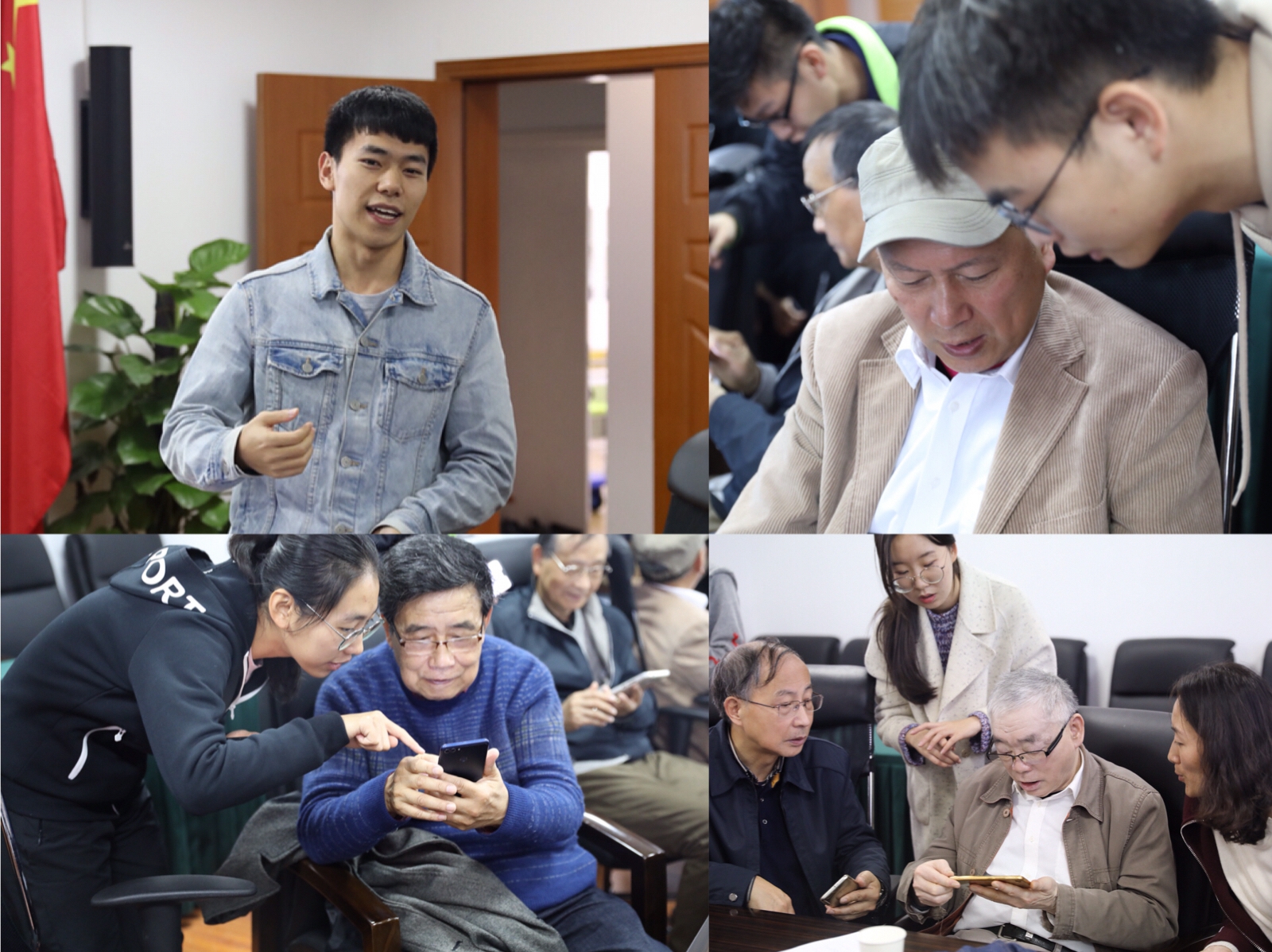 2016级本科刘步作为小讲师为老同志们讲授了手机微信及常用APP软件的使用。2018级9位学生作为助教进行现场指导。老师们认真地跟着小讲师学习智能手机相关技术及使用方法,遇到困难时直接向身边的助教寻求帮助。活动现场老先生们学习热情高涨,不时还有老先生询问平时手机使用中的常见问题,同学们都逐一耐心解答。一节课后,老同志们意犹未尽,对同学们的授课与指导报以热烈的掌声,希望能开展更多师生互动的活动,保持终身学习态度、师生共同成长。