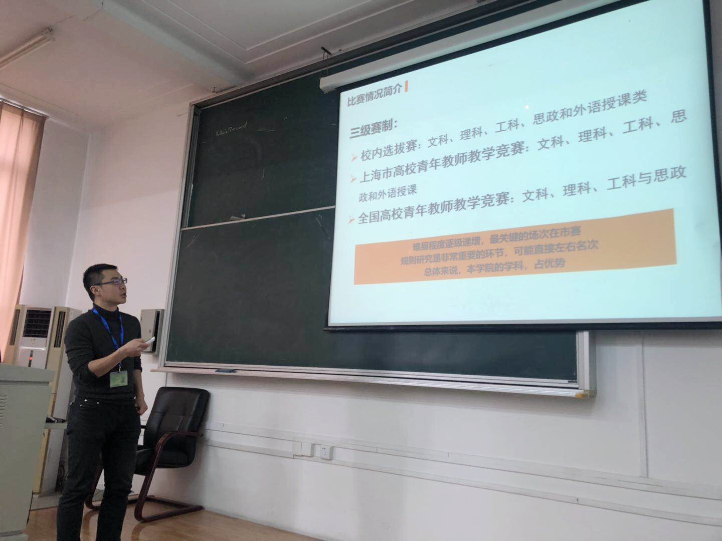 上海高校青教赛获奖者缪炜恺老师做了青教赛参赛经验的分享。他回顾了准备青教赛的各个环节及注意事项,介绍了上海市比赛和全国比赛的不同,并建议参加青教赛的老师提前一年做好规划。除了参赛经验分享,缪老师还针对如何上好一门课和大家做了交流。