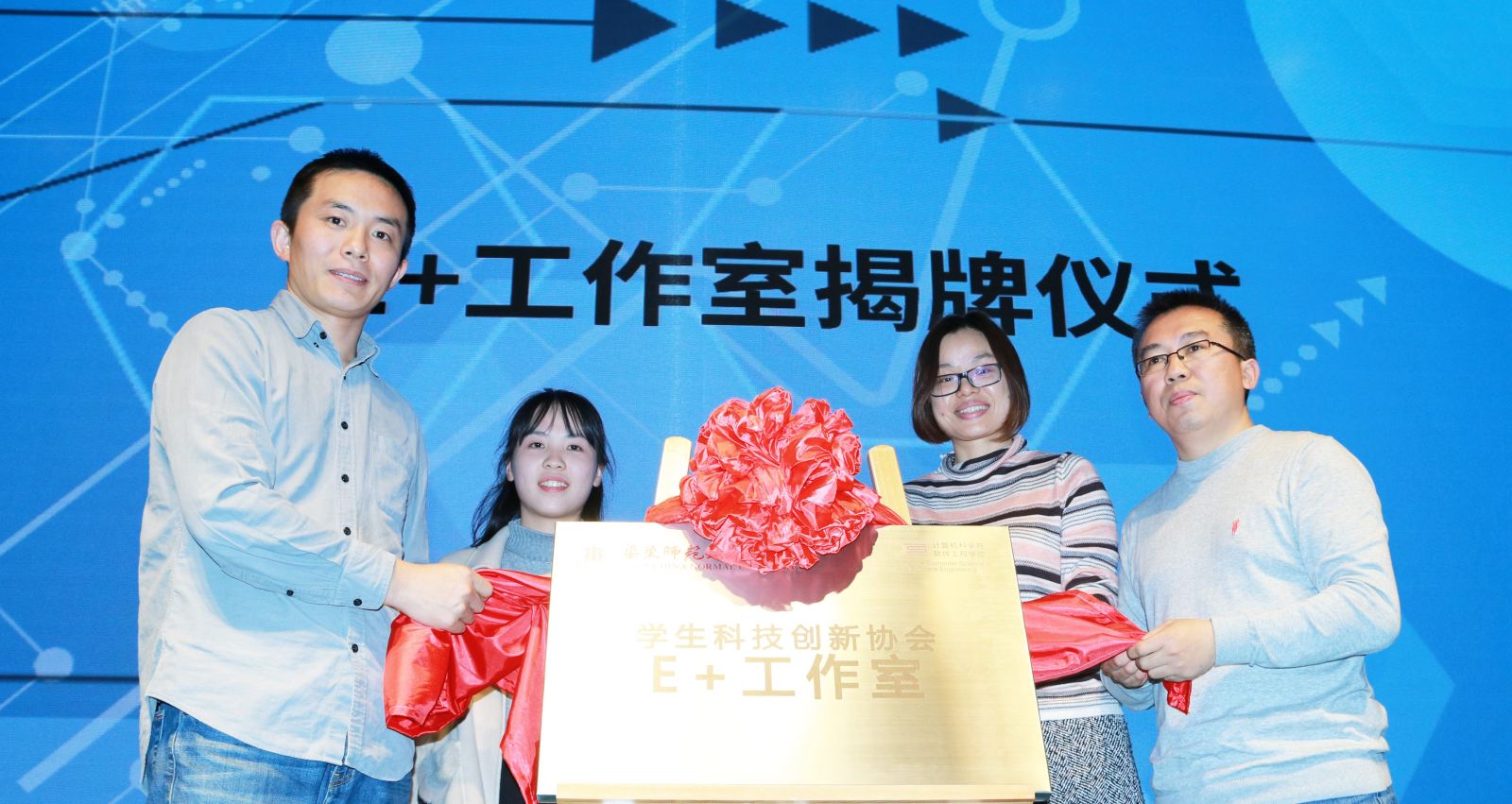 为了更好地凝聚跨学科创新人才,营造浓厚的科创氛围、培养学生实践能力,为智慧校园建设及社会各界的信息化升级提供技术支持,学院正式成立E+工作室(E取自ECNU的首字母,工作室谐音“一家工作室”)。学工部副部长李彦垒、就业办副主任刘继亮、学院副院长张敏、学生科技创新协会主席孙雨晶同学共同为工作室揭牌。