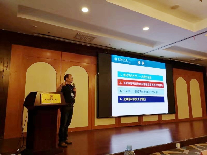 曹珍富教授做了题为“密码安全的可证明安全理论”的报告。本报告从通信入手,在提出保密通信要求的基础上,说明可证明安全理论的建立过程,包括互联网密码机制及这方面获得图灵奖的密码学成果,以及近年来面向云计算、大数据和AI驱动的安全计算问题,尤其是提出了处理这些问题的方法和理念。最后,他还介绍了该领域的部分研究成果,尤其是报告人团队在这方面取得的部分研究成果。