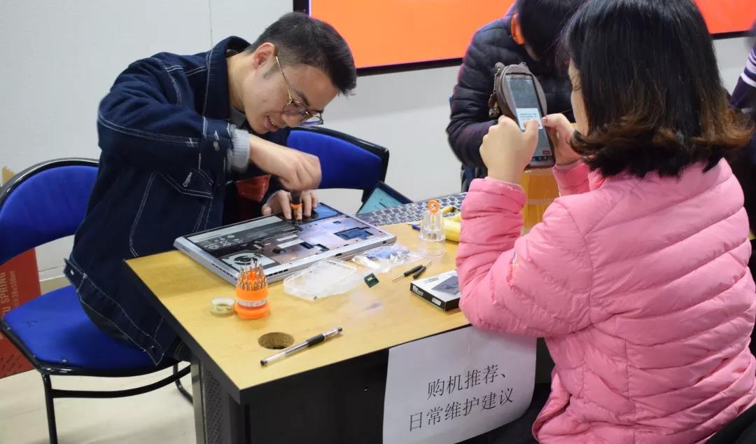 在前来寻求帮助的师生中,既有使用多年的老机器,也有才买不久的新机器,我们的志愿者也都一一耐心给予帮助,有不少机器是需要拆机处理的,我们的志愿者细心仔细的拆开电脑,或清灰、或安装内存条、或换硬盘等。