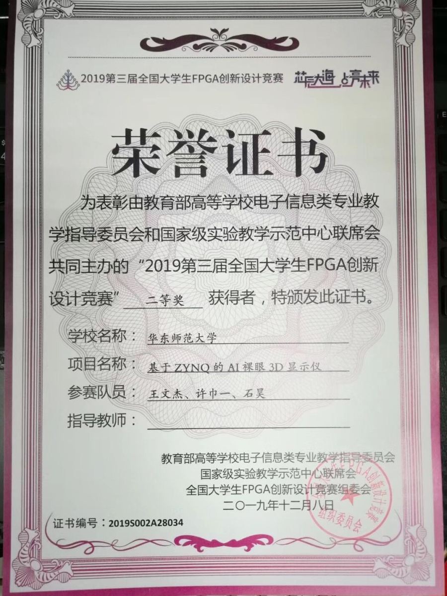 12月8日,2019第三届全国大学生FPGA创新设计竞赛复赛颁奖典礼在南京江北新区ICisC实训基地举办,德赢官网Vwin三位研究生王文杰、许巾一、石昊开发的作品《基于ZYNQ的AI裸眼3D显示仪》勇夺 二等奖!