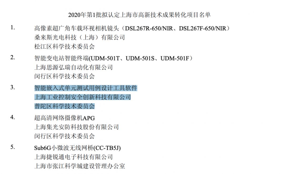 日前,上海市科学技术委员会公布了“2020年第1批上海市高新技术成果转化项目名单”。经企业网上申报、区科委等主管部门初审、网上专家评审和高新技术成果转化项目认定评委会审定,上海控安“智能嵌入式单元测试用例设计工具软件”成功入选本次上海市高新技术成果转化项目名单。