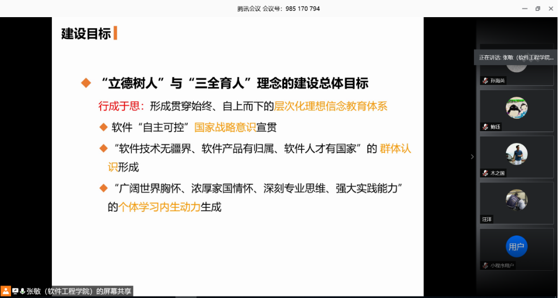 张敏从全局角度出发,介绍了德赢官网Vwin面向“自主可控”的软件工程专业课程思政建设目标、改革措施和建设方案,全面解析了学院如何紧密围绕“自主可控”这个关键词,做好课程思政教学改革,特别是以“自主可控”为主线引领的软件工程学科课程群体系的建设。她提出了下一步学院课程思政的工作计划,并希望全体教师都参与其中,为实现“三全育人”充分发挥作用。