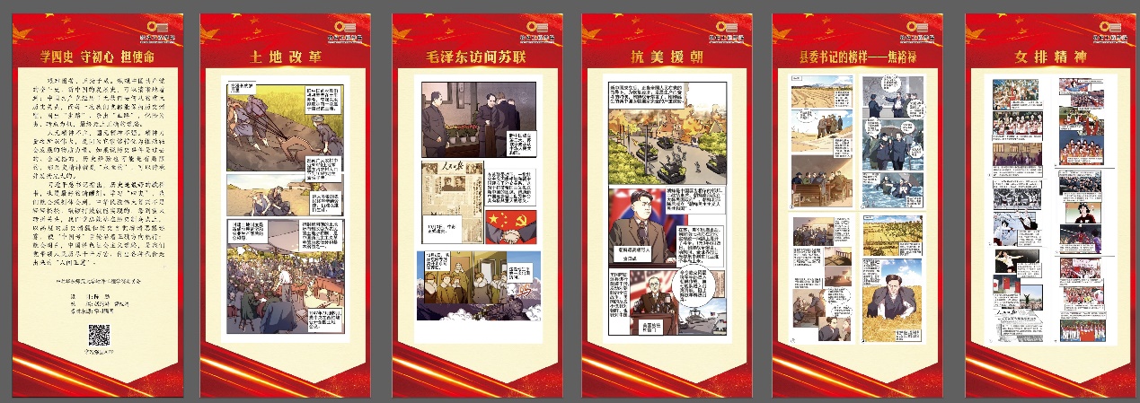 “新中国史”部分围绕土地改革、毛泽东访问苏联、抗美援朝、县委书记的榜样——焦裕禄、女排精神五个主题,通过漫画的形式,生动形象地展现了中国共产党的奋斗史、新中国的发展史,艰难困苦、玉汝于成。